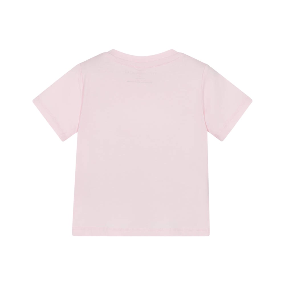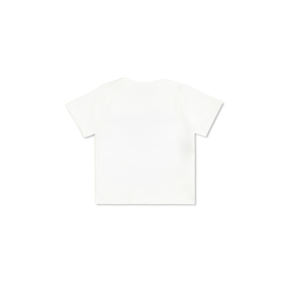 Cappellino e pantaloni beige a righe con logo, t-shirt bianca con logo beige ricamato e patch logo sulla manica. -