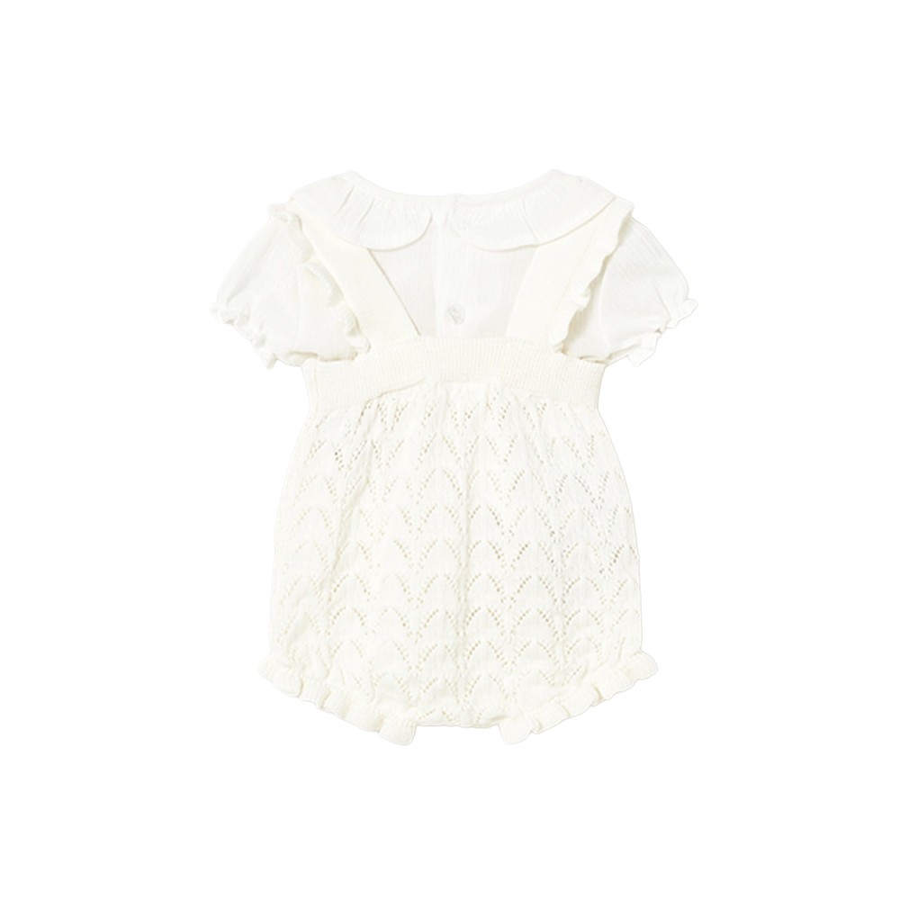 salopette rosa tricot con caviglie volant e bretelle volant.