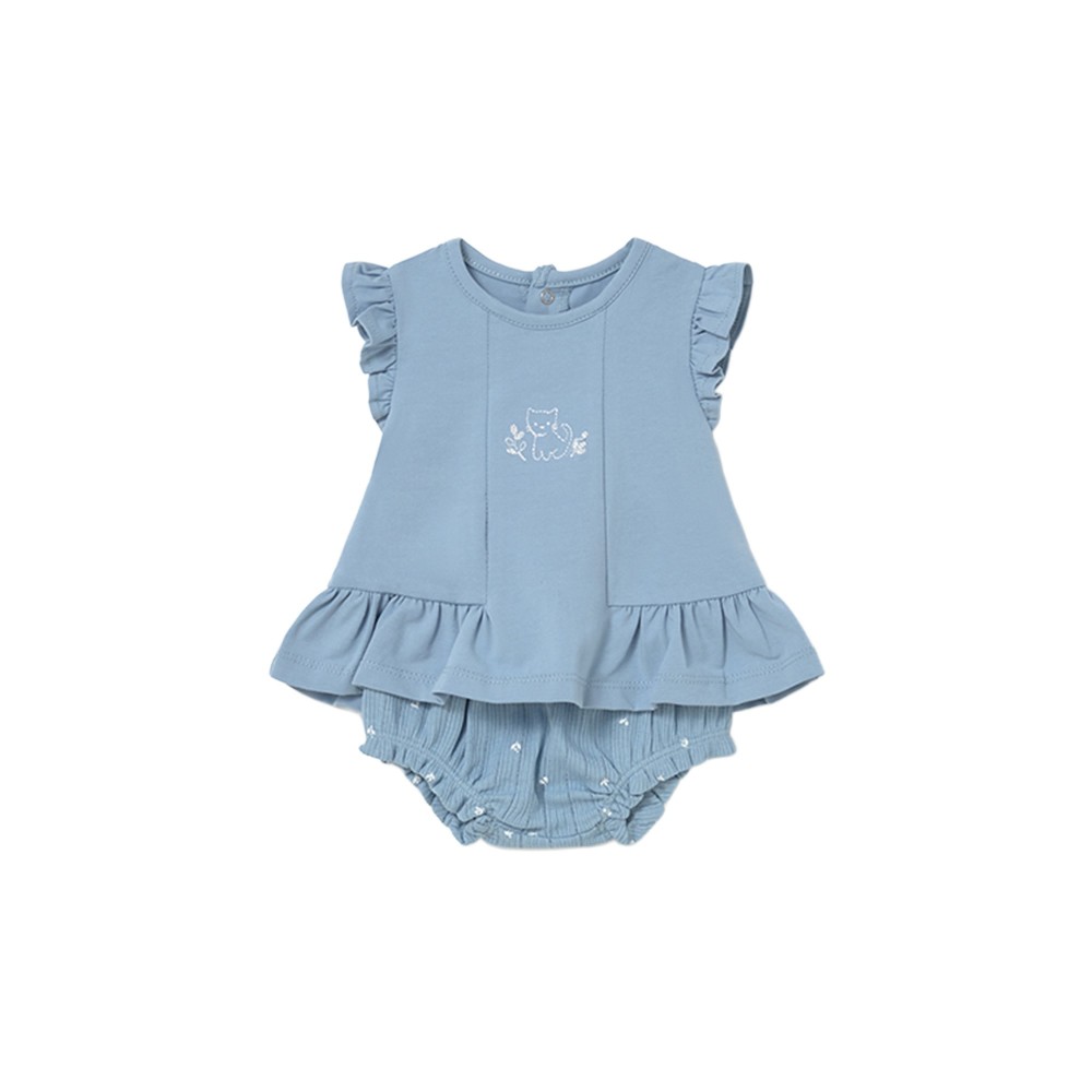 Costume celeste con stampa fiori, orlo smerlato, laccetto fucsia.