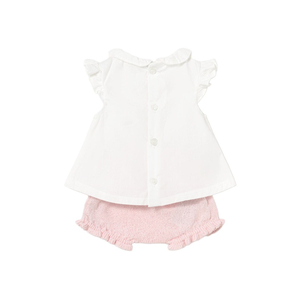 Tutina bianca con roselline rosa ricamate, colletto classico,