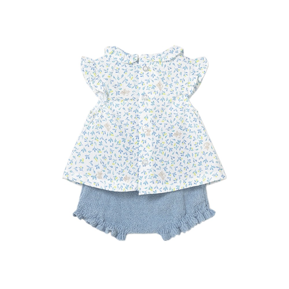 volant celesti e chiusura con bottoncini sulla spalla. -