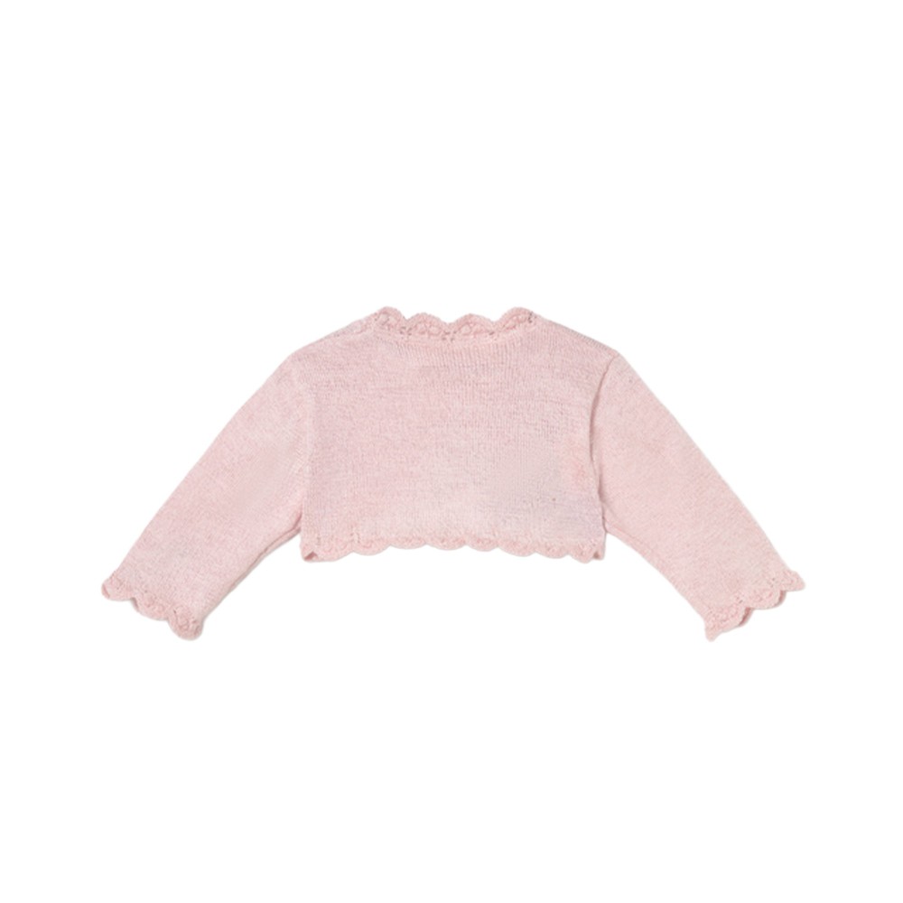 giacca rosa lavorata e traforata con orli smerlati e bottoncini. -