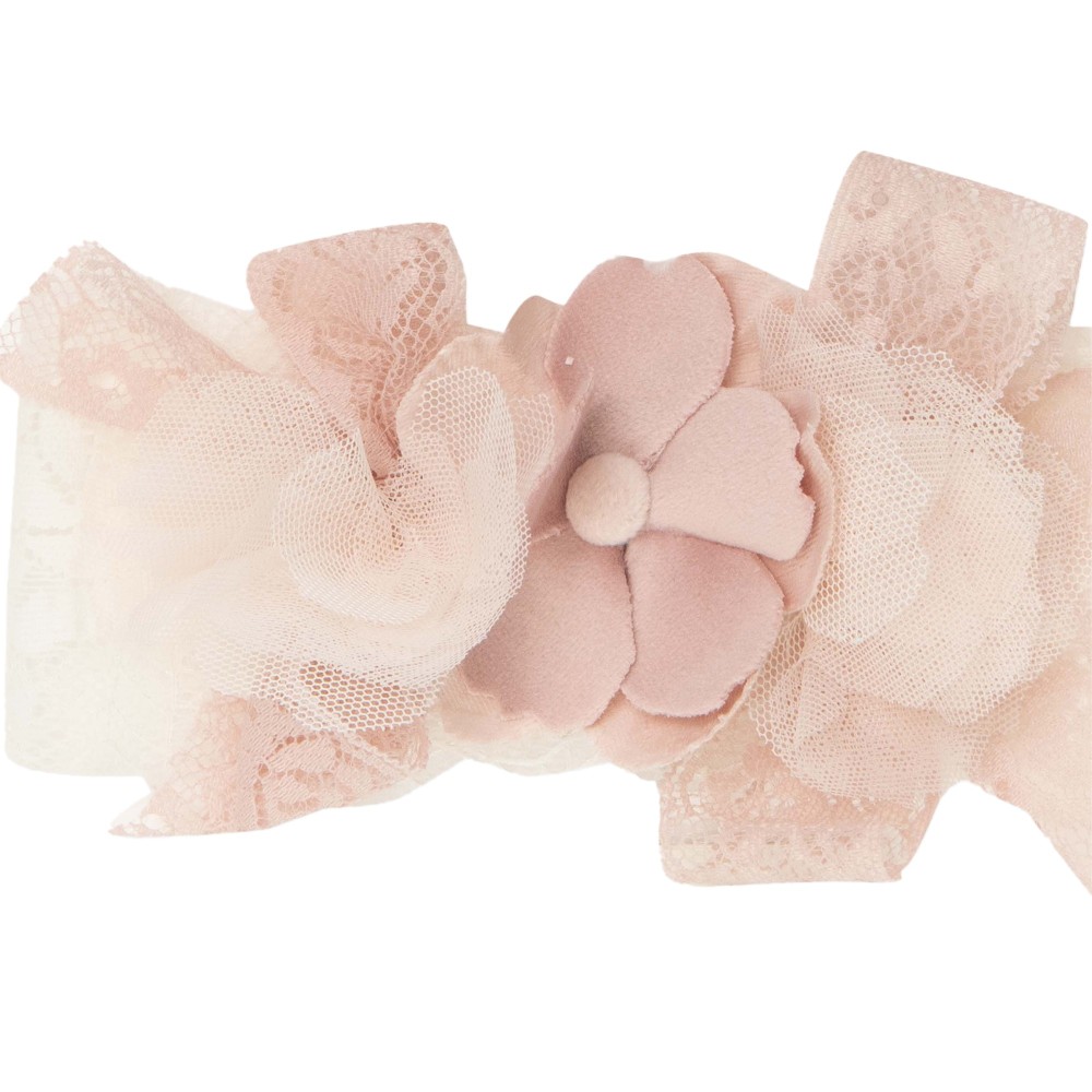 Fascetta in pizzo con fiocco applicato, rosa frontale in organza. -