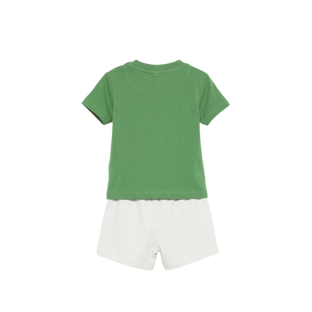 T-shirt verde con logo sul petto, shorts bianchi con logo verde,