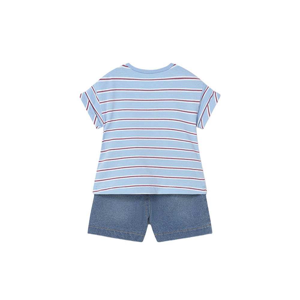 T-shirt bianca, salopette tricot azzurra con dettagli a righe,