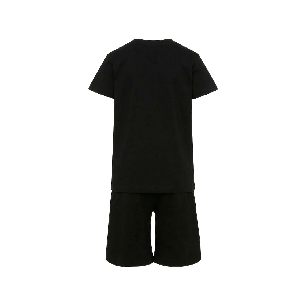 T-shirt nera con logo sul petto, shorts neri con logo bianco,