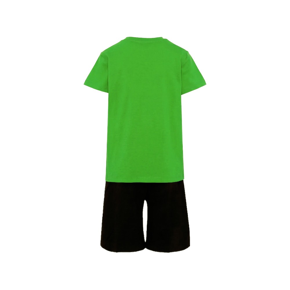 T-shirt verde con logo sul petto, shorts neri con logo verde,