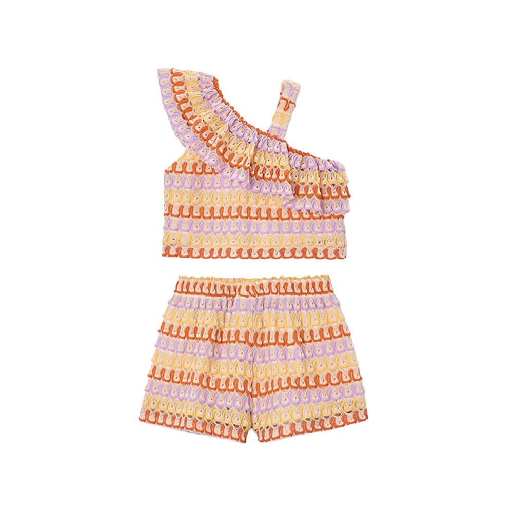 con bretelle a fiocco ricamate, shorts con vita elasticizzata,