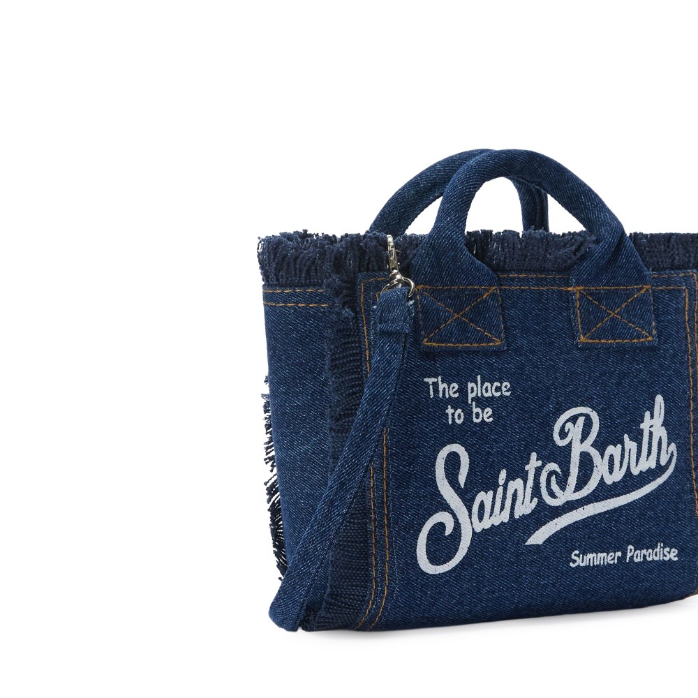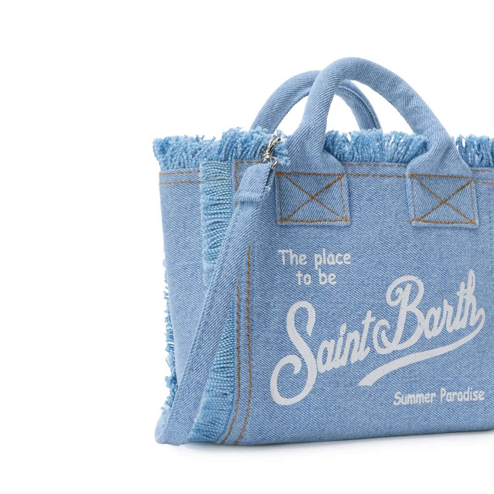 Realizzata in denim con dettagli bianchi, tracolla denim,