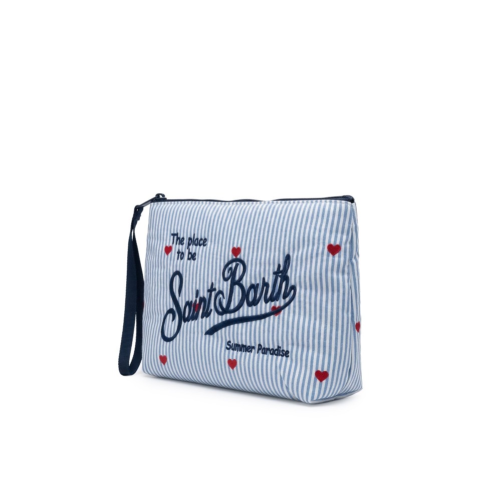 In canvas, stampa a righe rosa, tracolla e scritte blu navy,