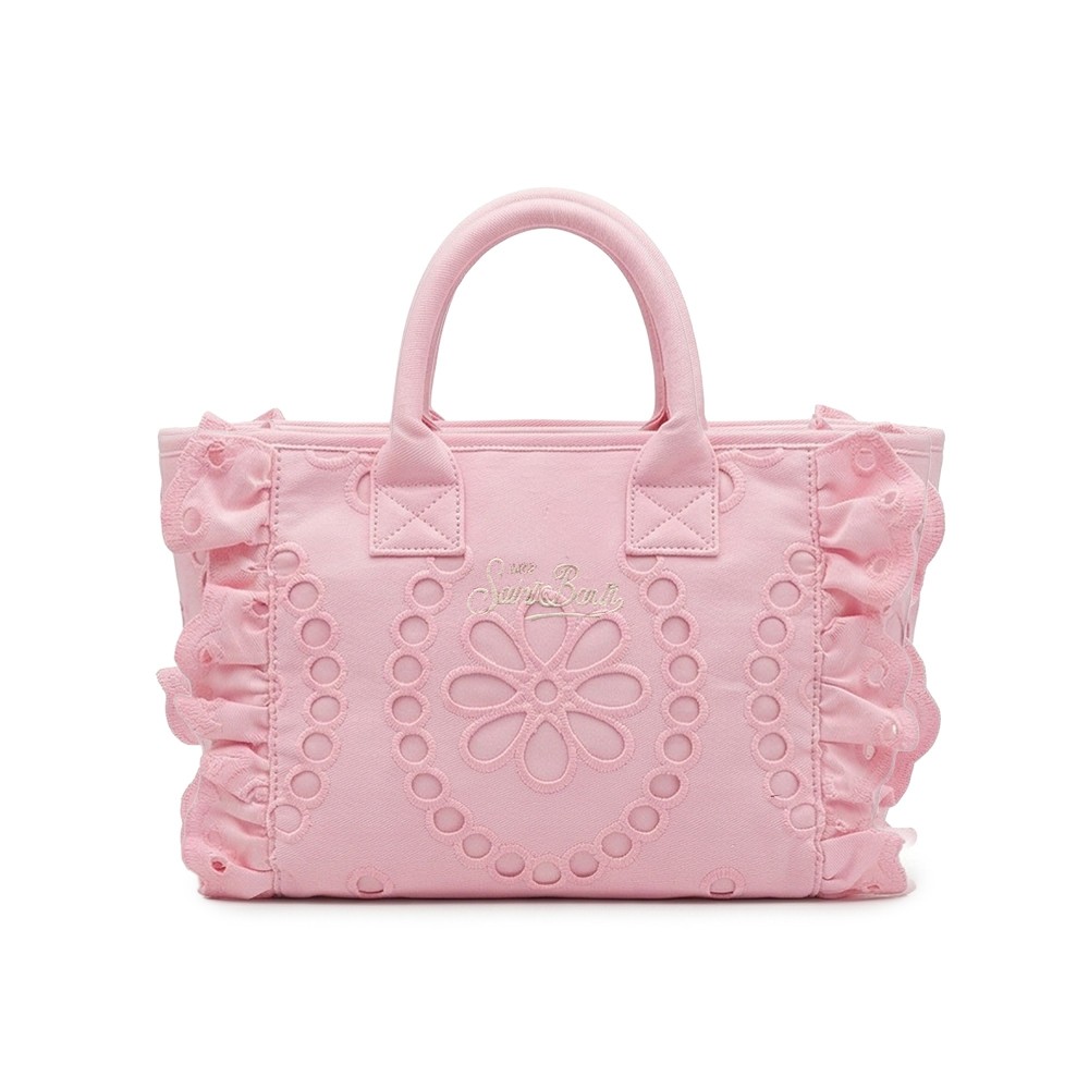 Realizzata in cotone, design sangallo, tracolla rosa,