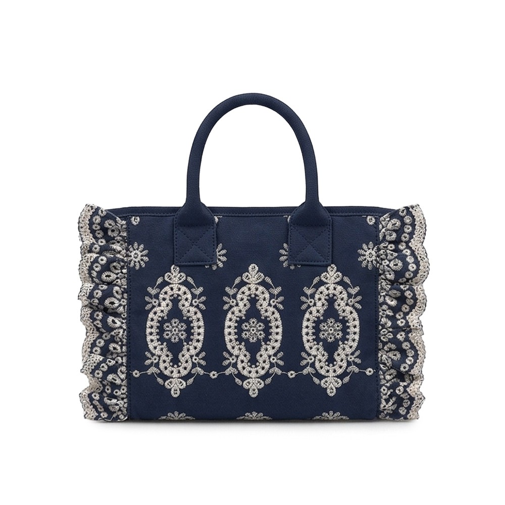 Design in sangallo volant blu navy, tracolla regolabile,
