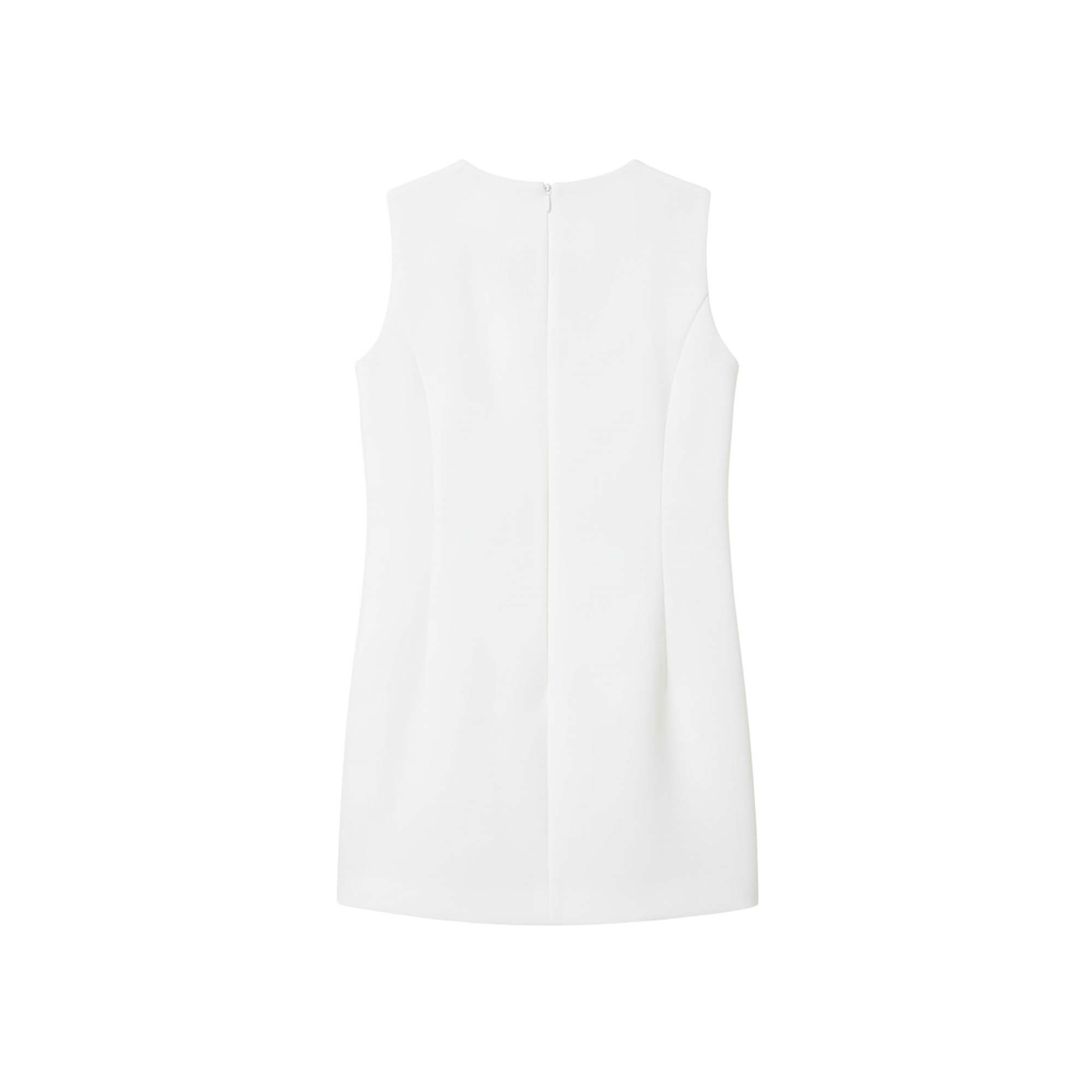 Finta cintura con fiocco logato, tagli fianchetto davanti e dietro, spacco al fondo, chiusura con zip sul retro, fodera e linea fitted.