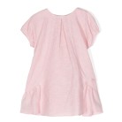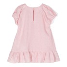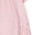 Abito rosa in lino/fibra di lino motivo a quadri logo ricamato laterale dettaglio con ruches scollo rotondo maniche corte a palloncino
