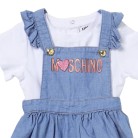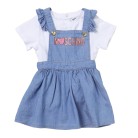 Abito a salopette denim con stampa rosa/blu motivo a cuore con paillettes stampa con logo sul davantiT-shirt scollo rotondo