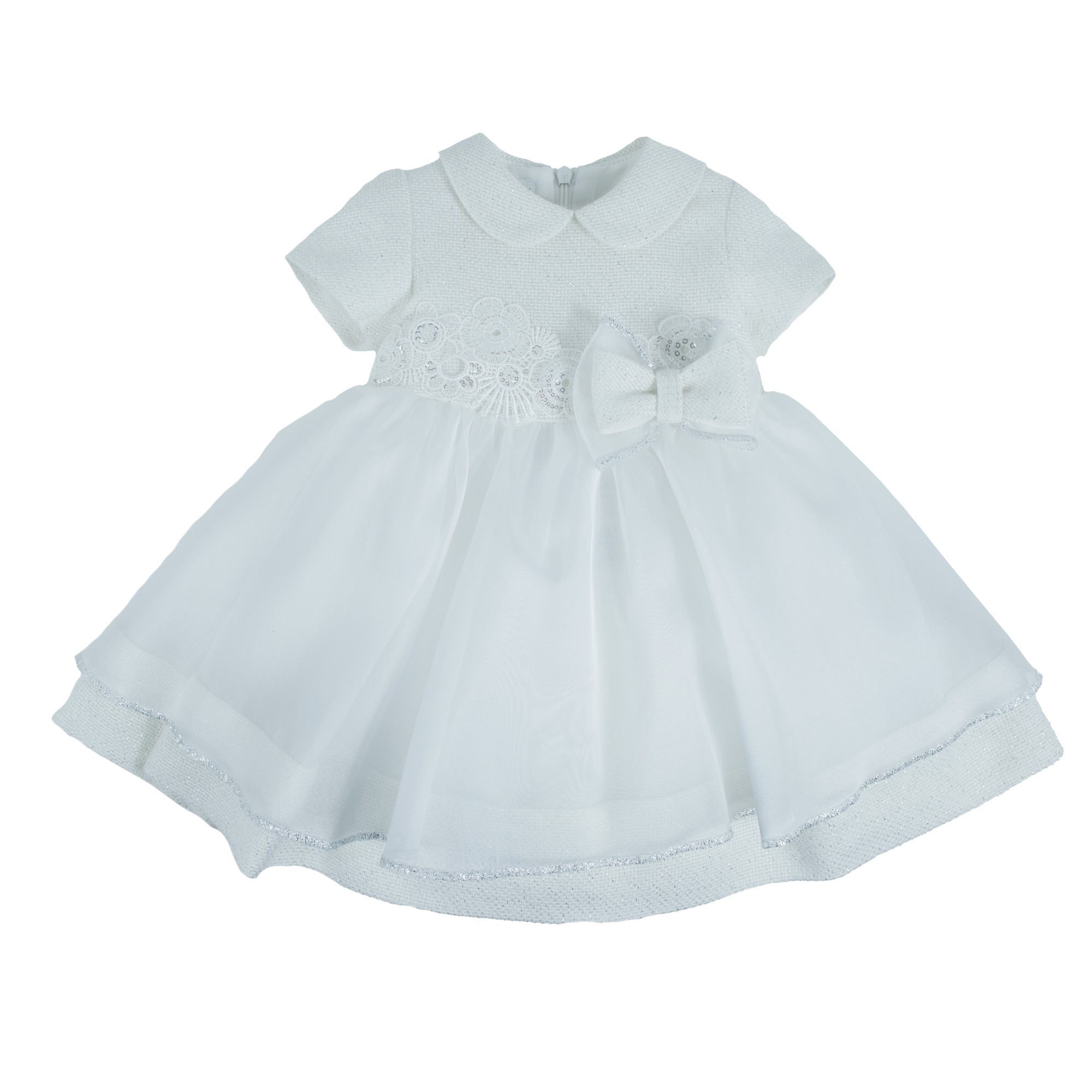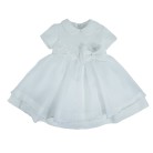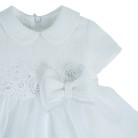 Abito manica corta in tessuto laminato argetto sul petto applicazione in pizzo con paillettes e fiocco balza in tulle con profilo argento fodera in tulle e apertura posteriore con zip