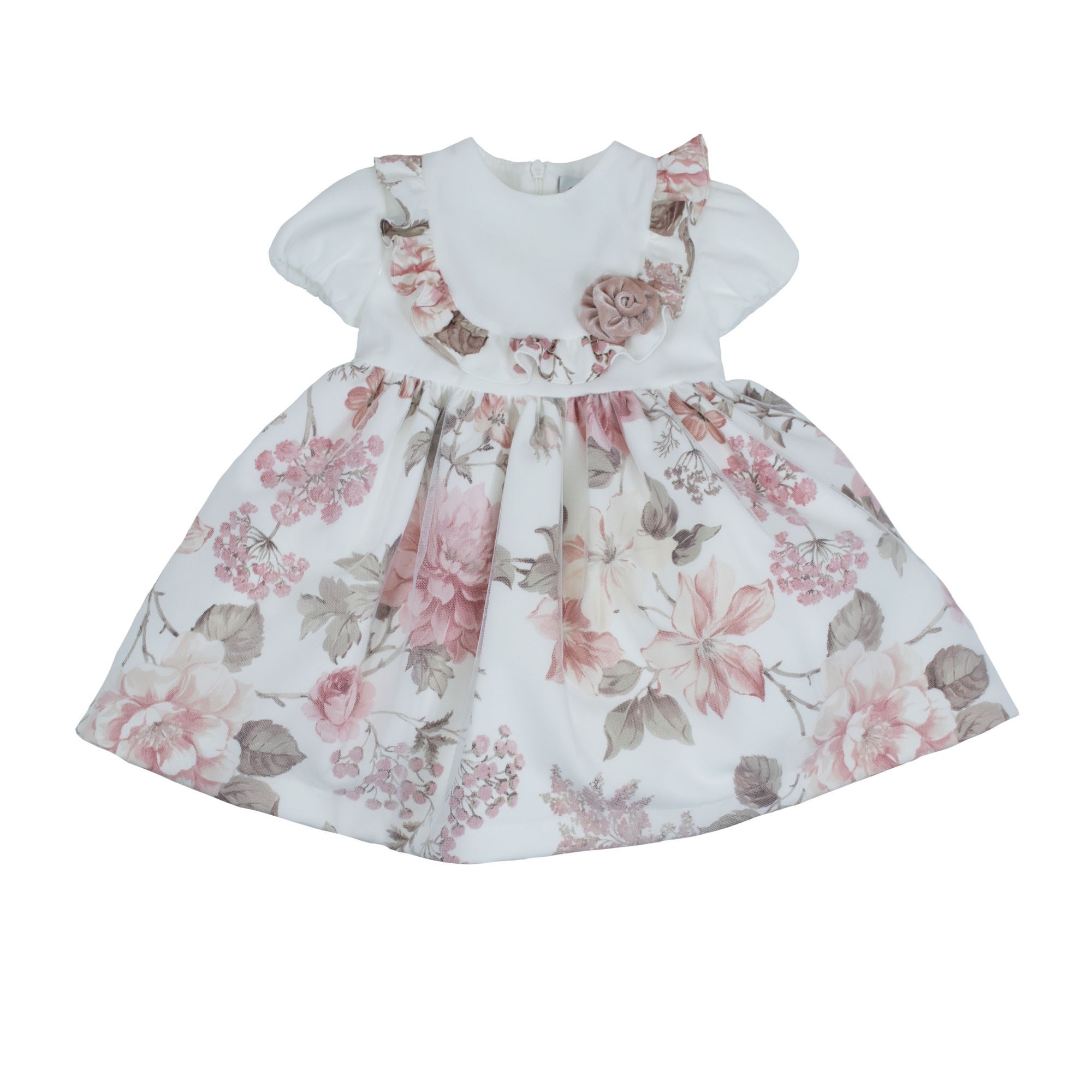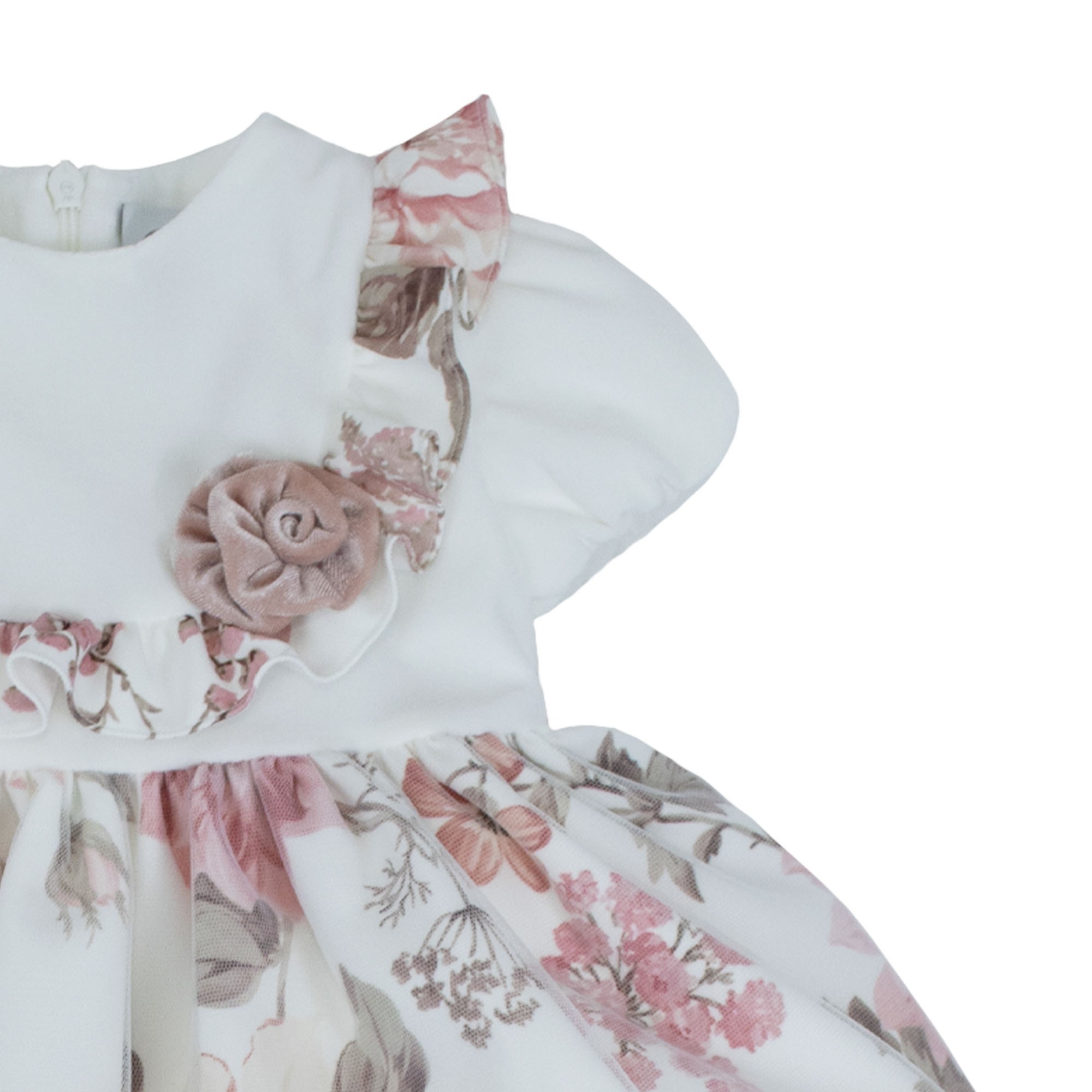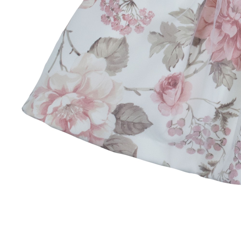 Abito girocollo con manica corta, tessuto morbidissimo stampato a fiori effetto ciniglia ricoperto con un velo di tulle rouge e rosellina decorativa avanti apertura con zip invisibile posteriore fascia con fiocco dietro doppia fodera interna in cotone con balza in tulle tulle
