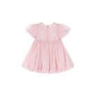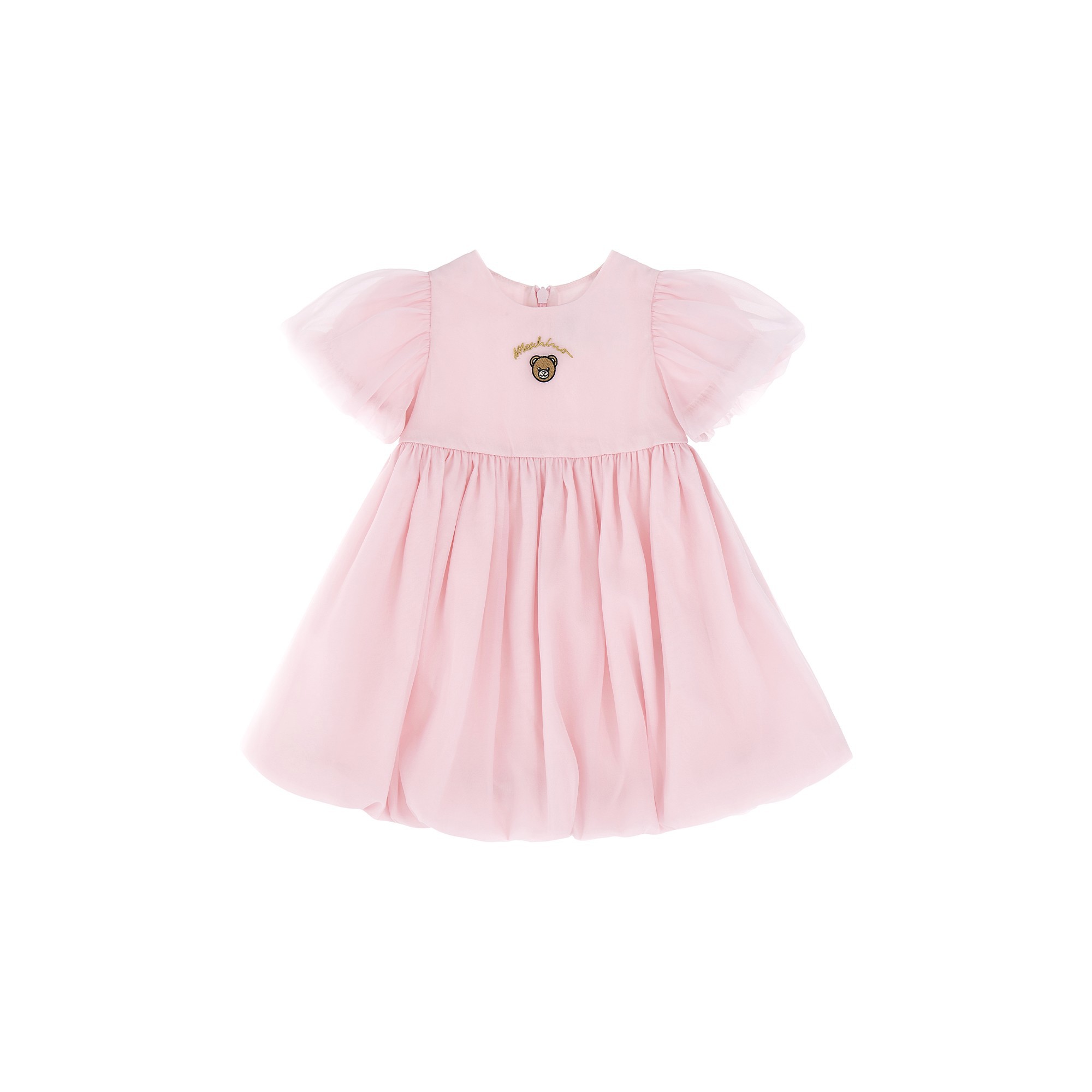 maniche a palloncino, chiusura con zip, gonna volant plissettata.