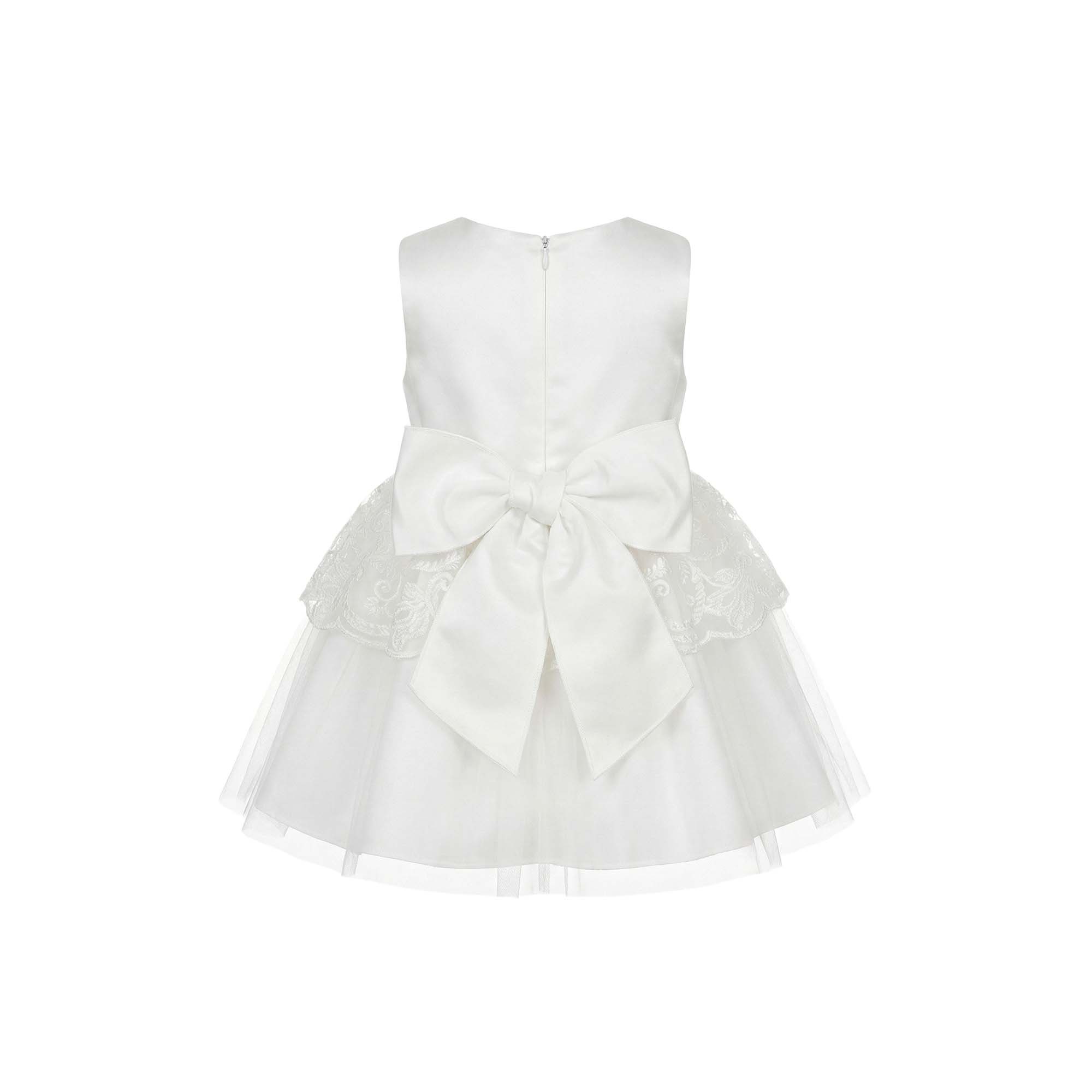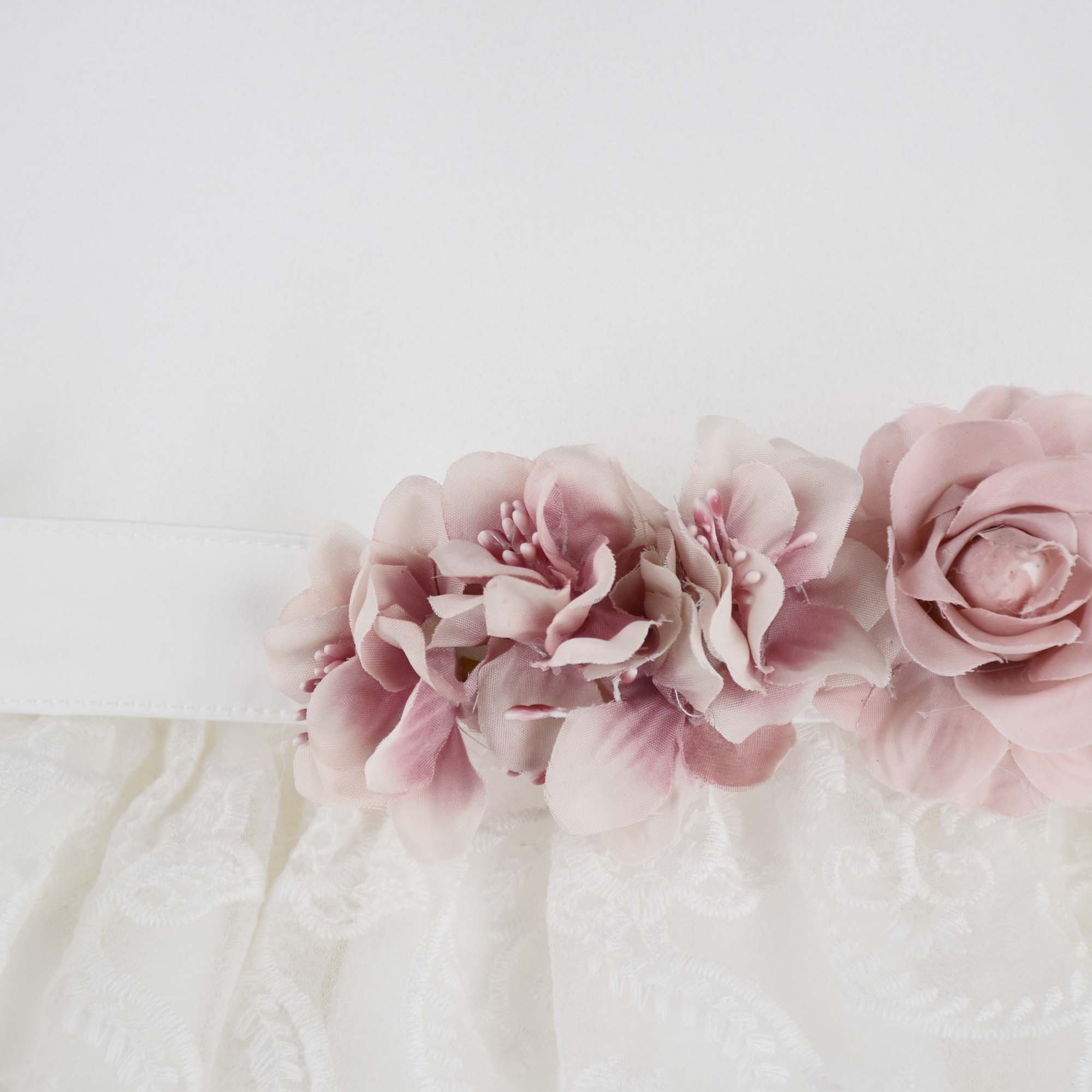 cintura con fiori rosa e fiocco posteriore, chiusura con zip.