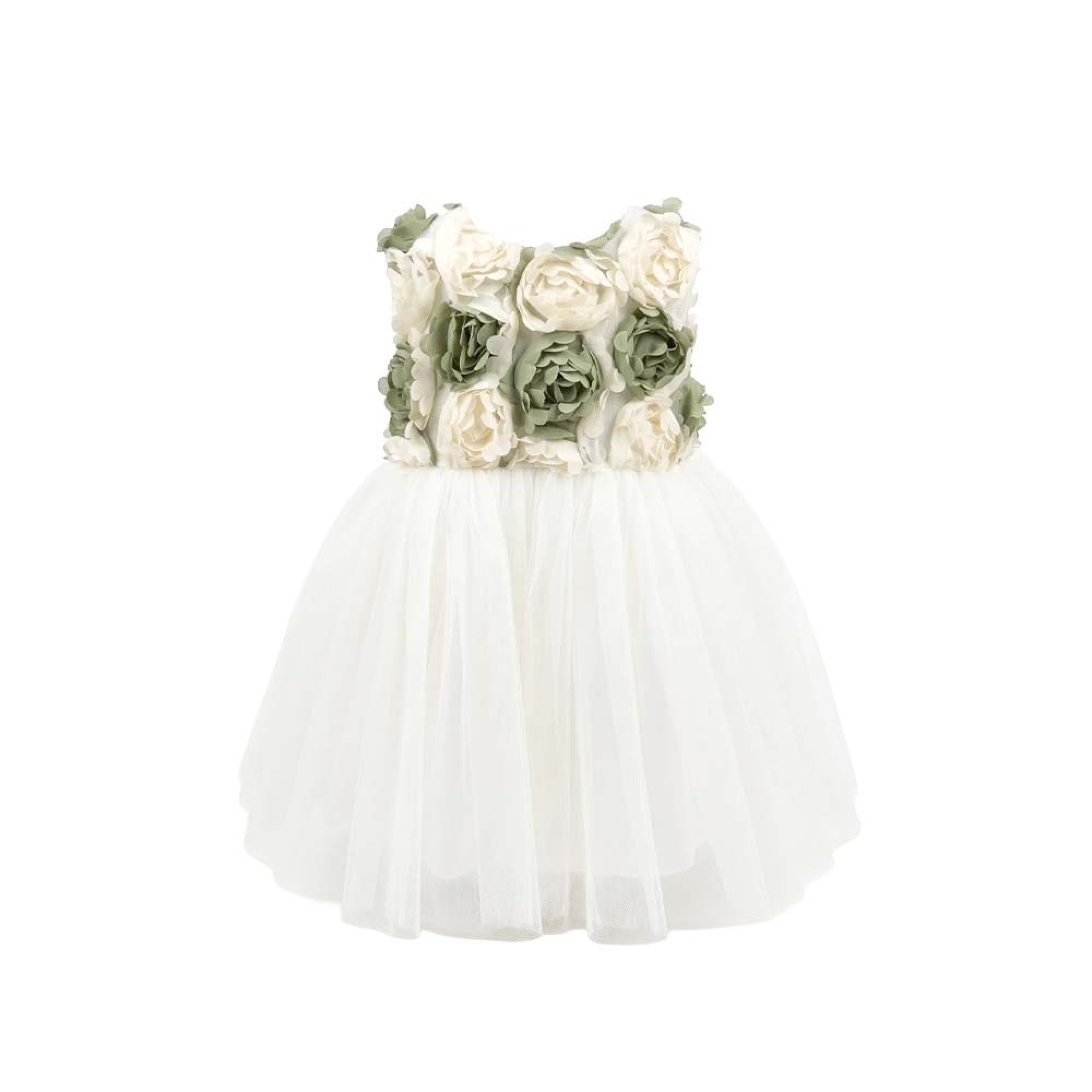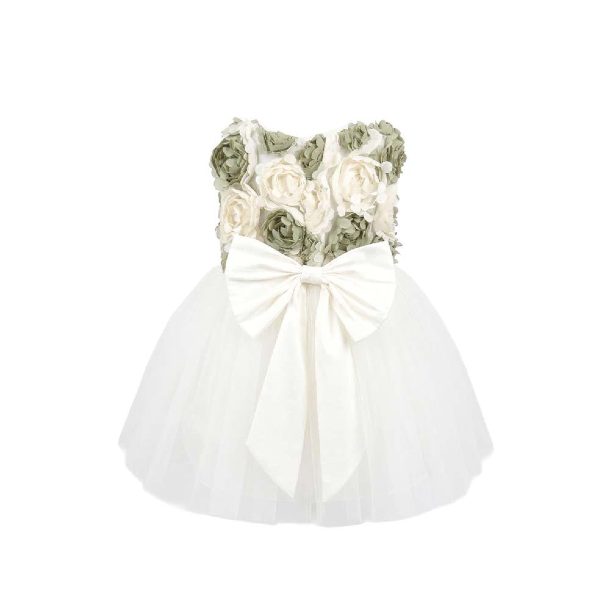 corpetto floreale bianco e verde, fiocco bianco posteriore.