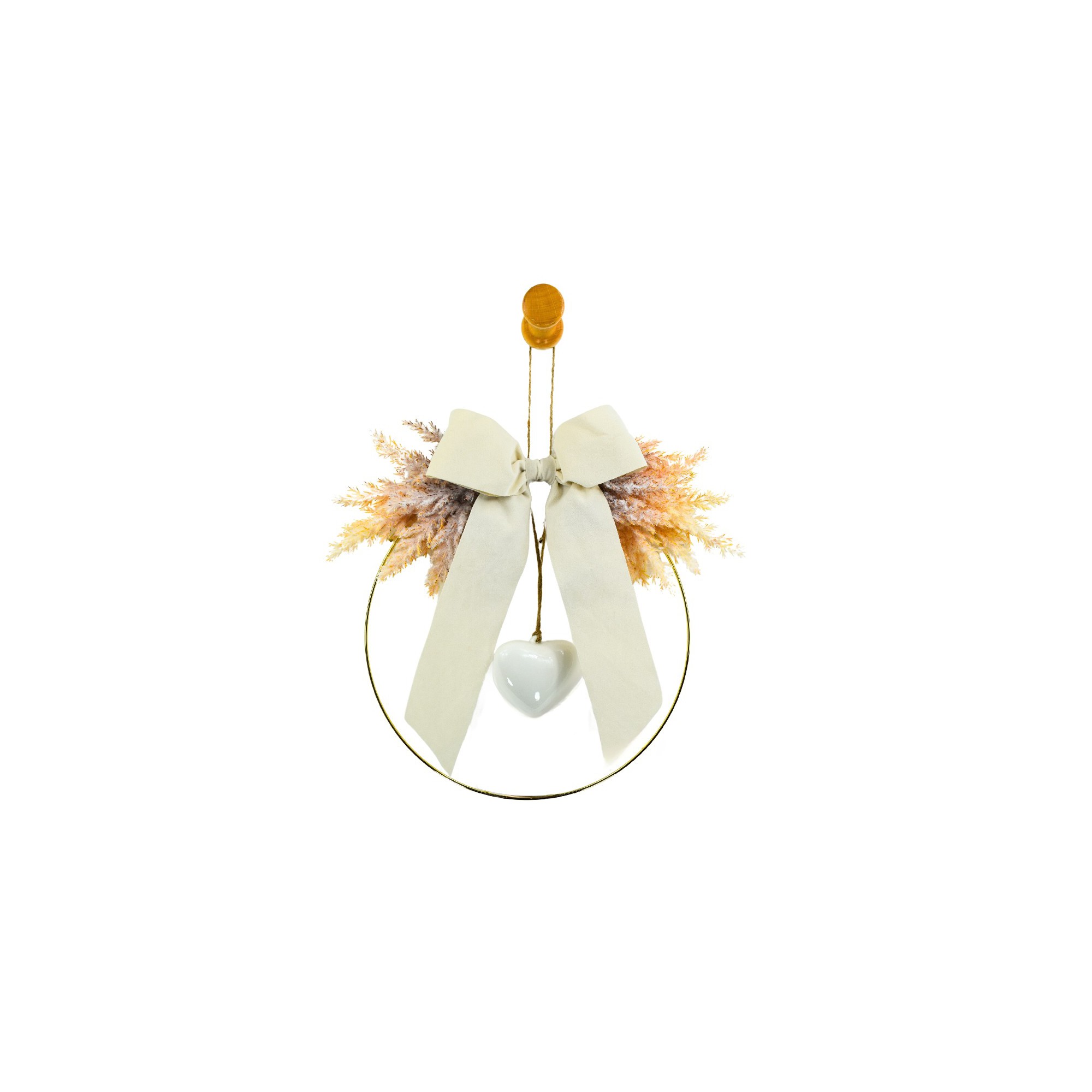 Fiocco nascita in raso decorato con mazzettini di fiori secchi applicati su un anello in metallo d'orato con un cuoricino di ceramica su cui si puo' scrivere il nome del neonato