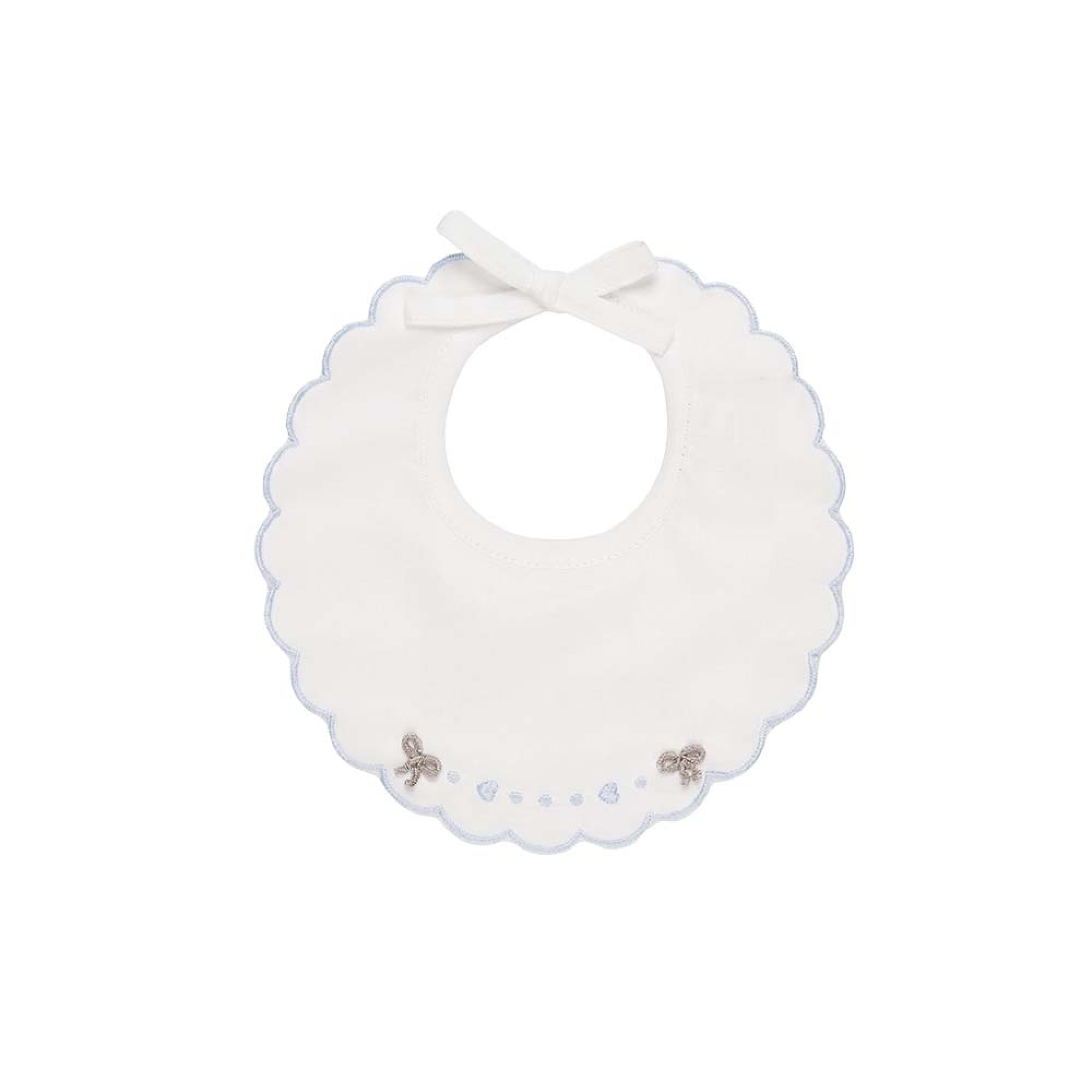 design con profili celesti, ricamo cuoricini e fiocchetti.