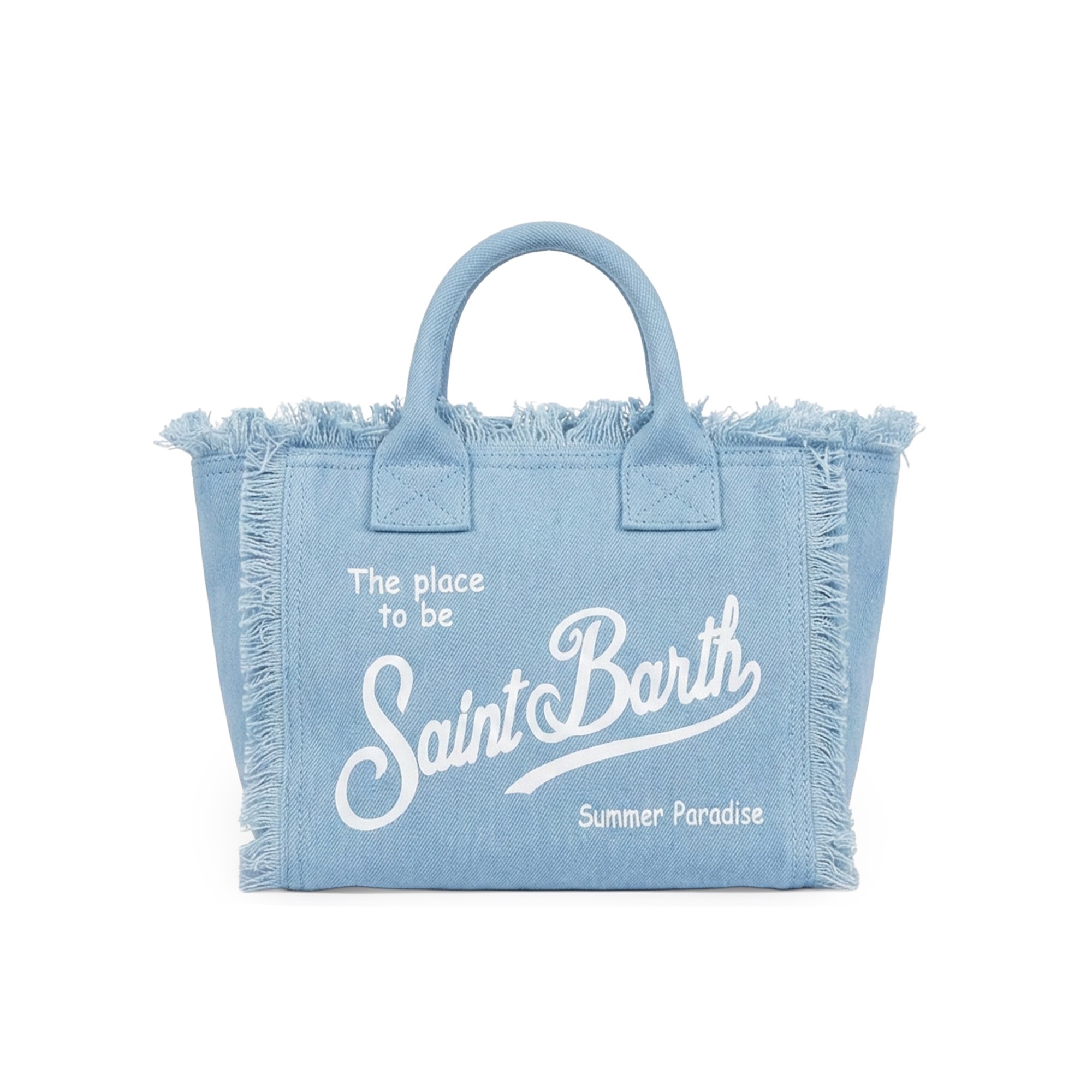 logo bianco frontale, frange sugli orli, due manici superiori.