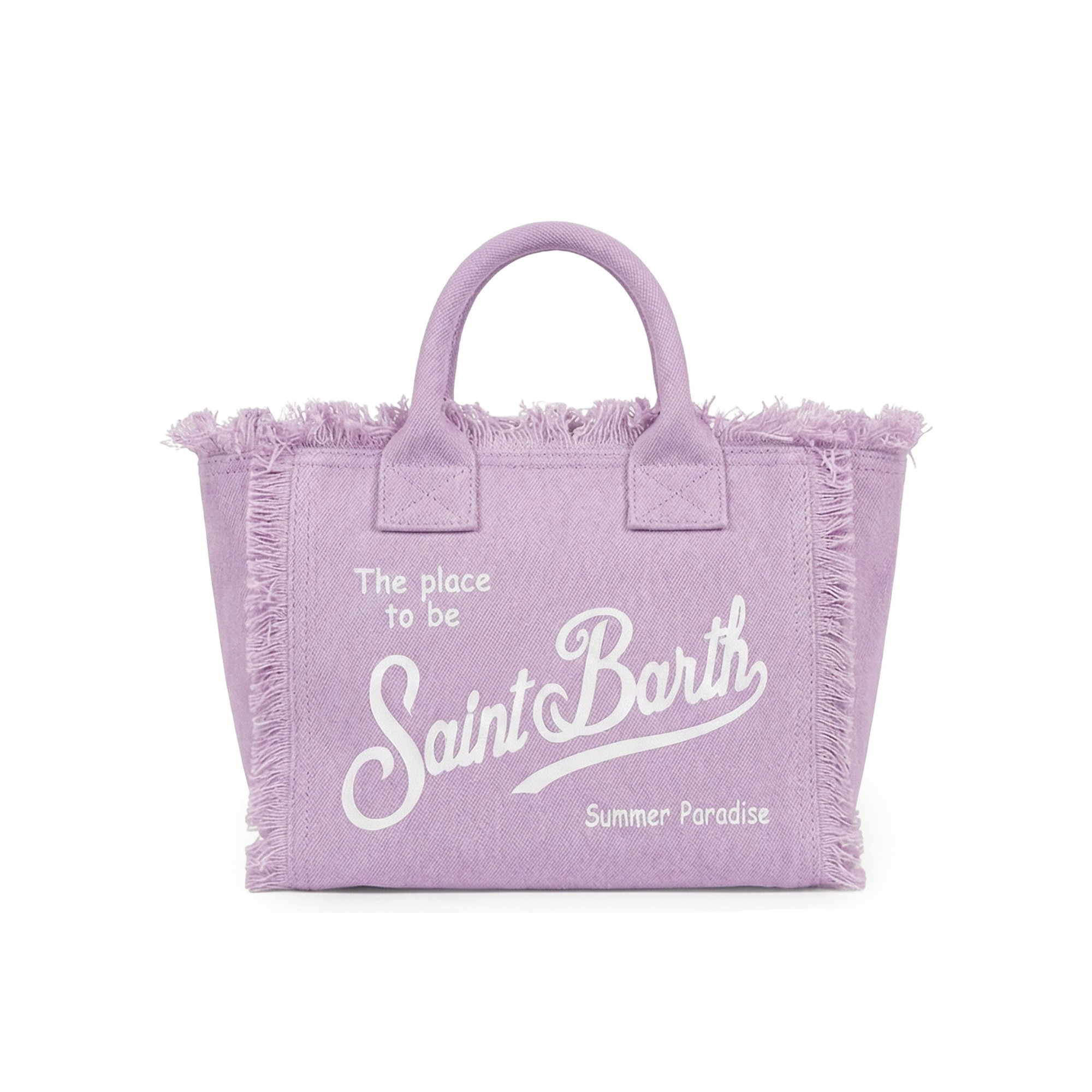 logo bianco frontale, frange sugli orli, due manici superiori.