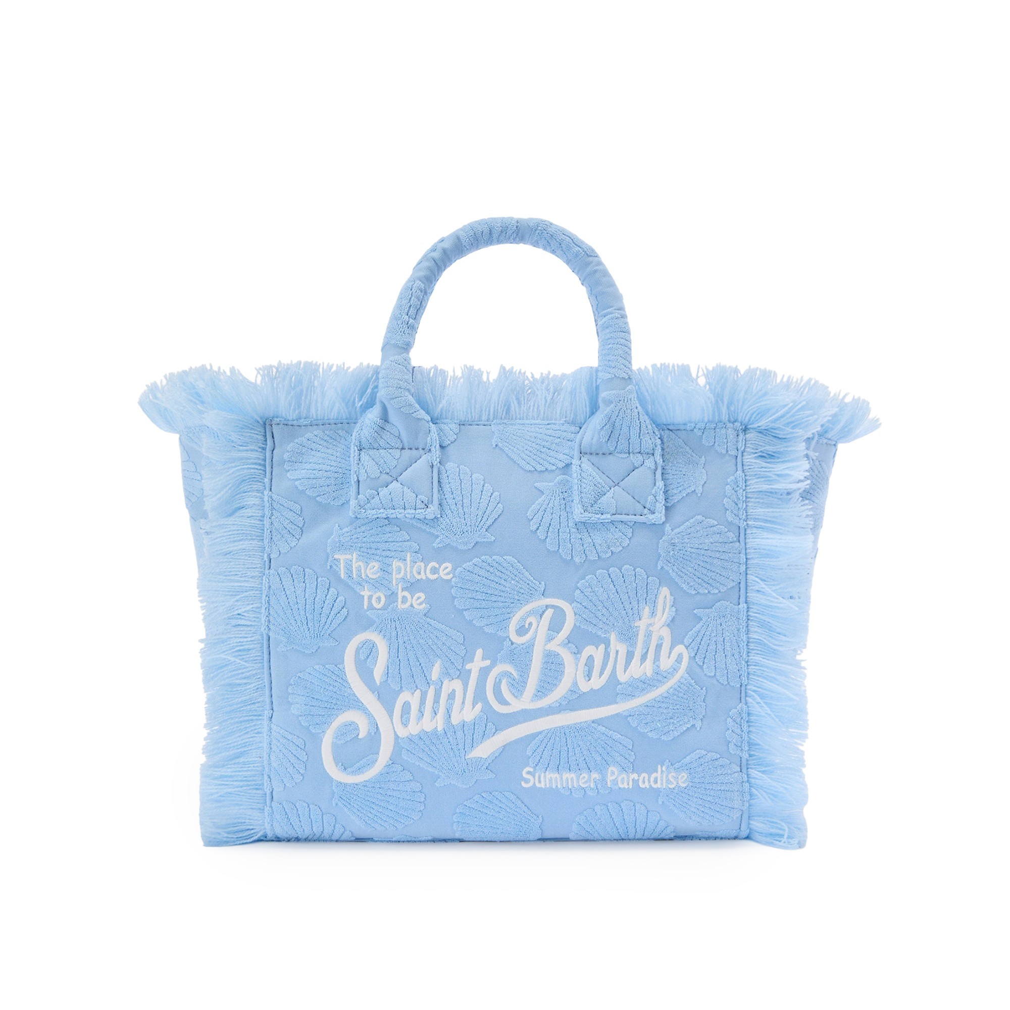logo bianco frontale, frange sugli orli, due manici superiori.