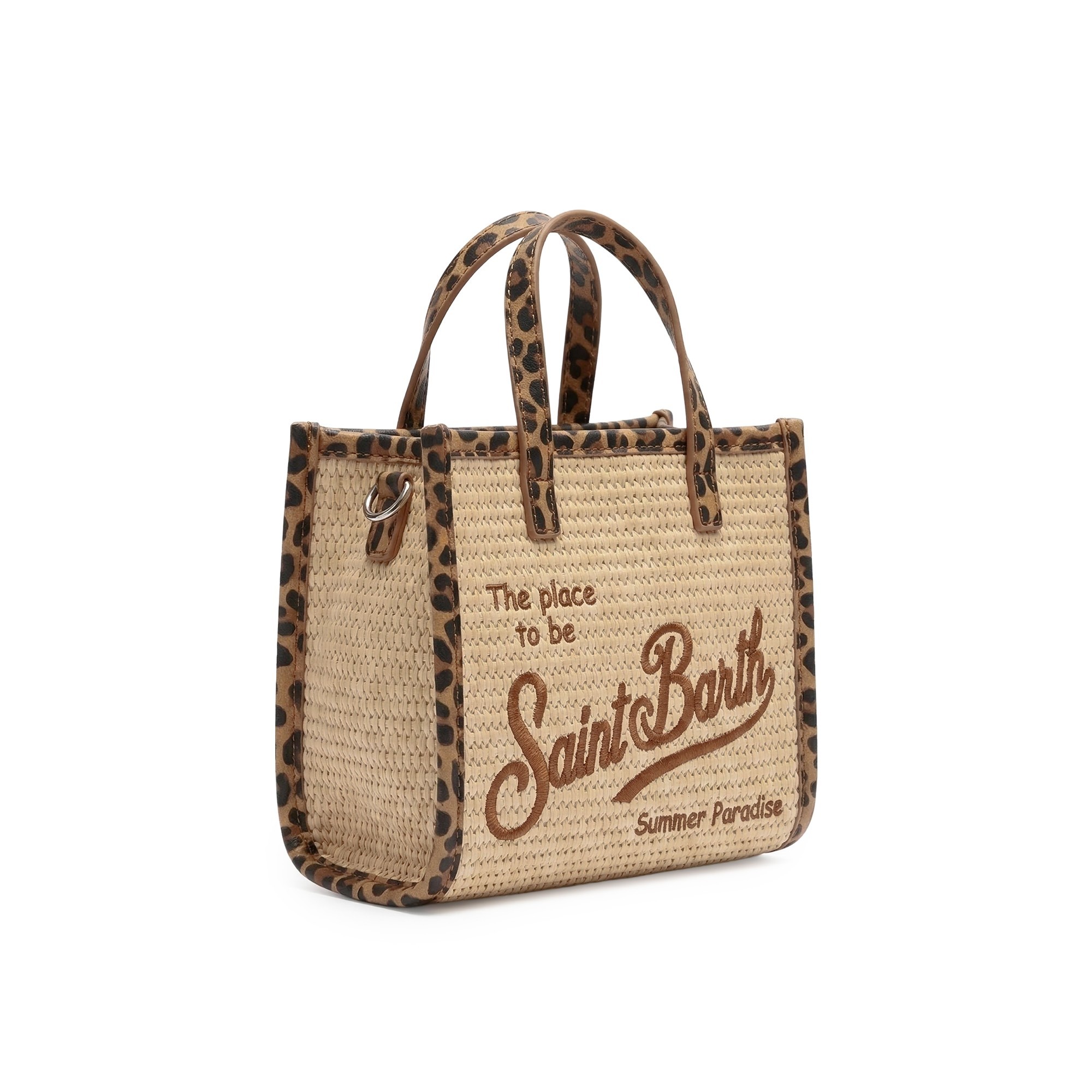 Realizzata in rafia intrecciata, profili leopardati in pelle,