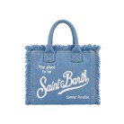 logo bianco frontale, frange sugli orli, due manici superiori.