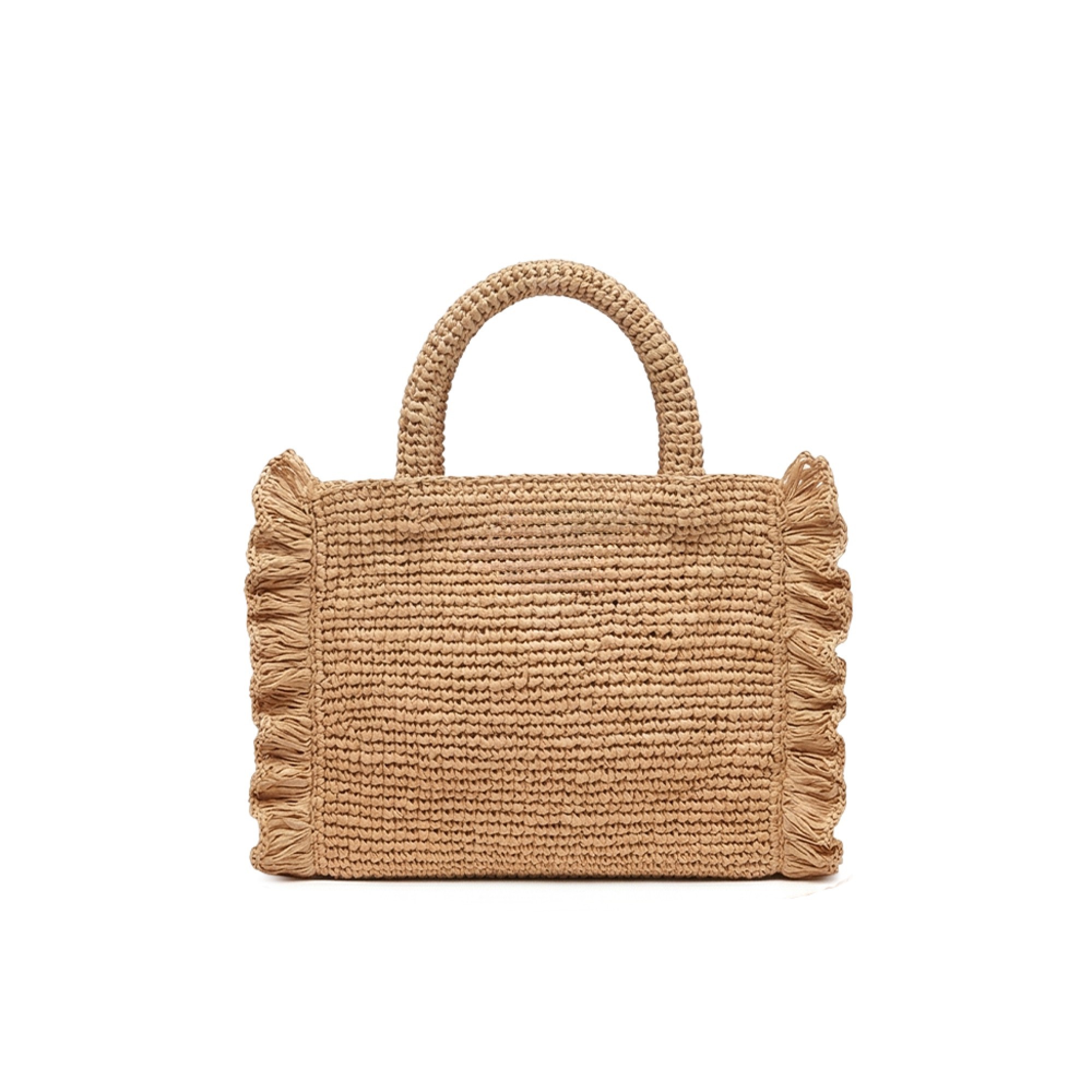 Realizzata in rafia beige intrecciata, volant laterali,
