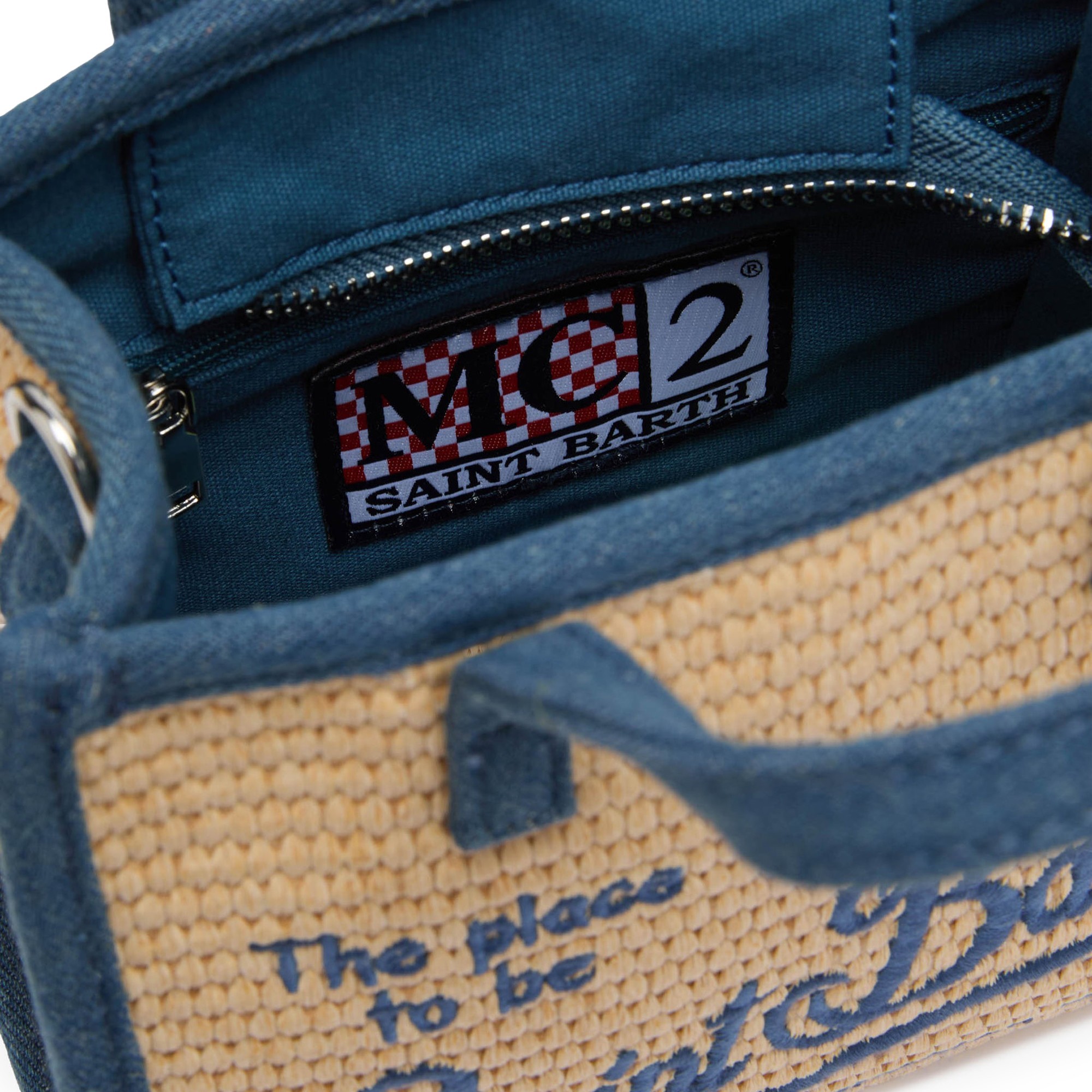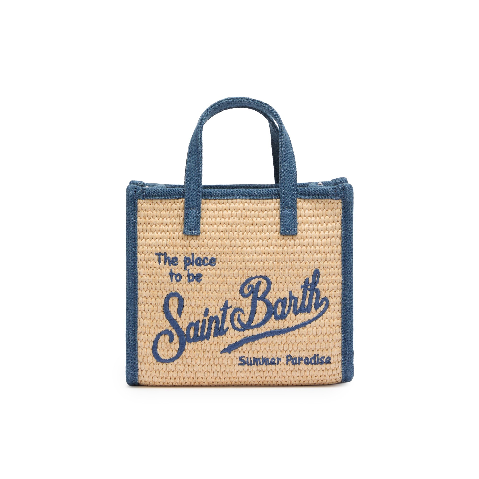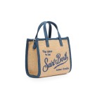 Realizzata in rafia intrecciata, profili in denim,