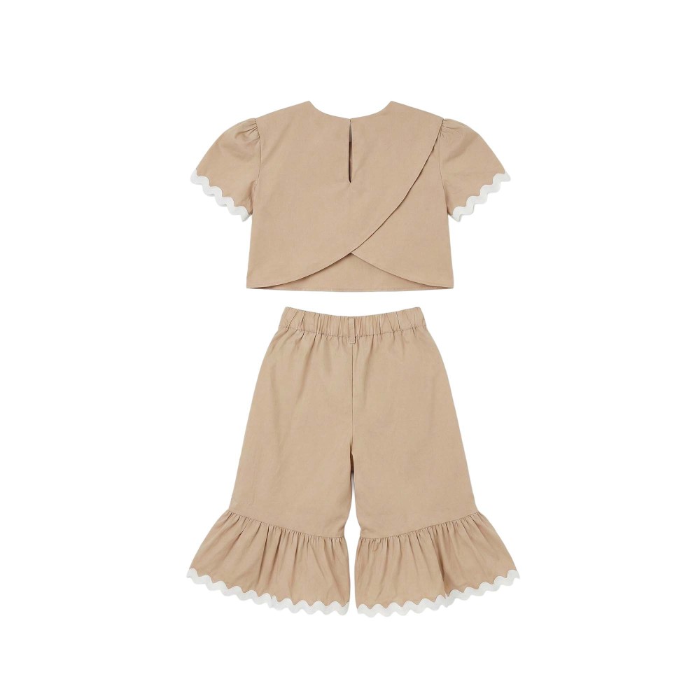 T-shirt beige fit cropped, profili bianchi ondulati,