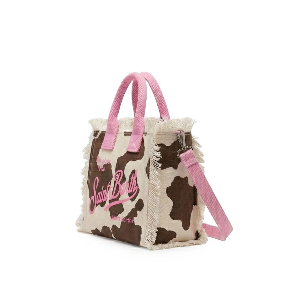 Realizzata in cotone con stampa cow skin, tracolla rosa,