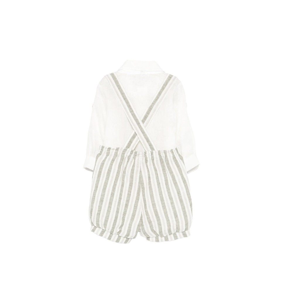 Pantaloncini salvia a righe con bretelle e bottoni. -
