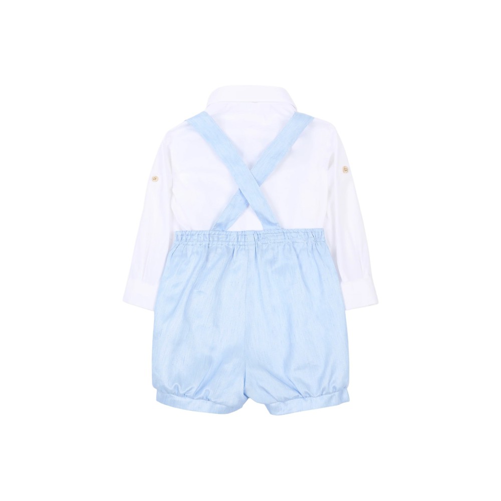 Pantaloncini celesti con bretelle e bottoni, vita elasticizzata. -