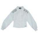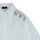 Camicia in cotone popelin elasticizzato, collo classico, chiusura con bottoni, sulle spalline applicazione di micro catenine argento con effetto frangia maglia a coste elasticizzata sui polsi e lato fianchi con effetto bustino