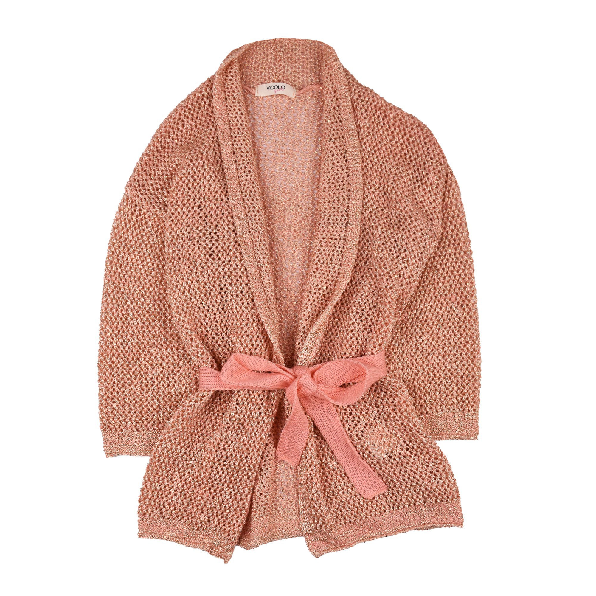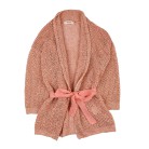 Cardigan lungo in filo salmone lavorazione traforata con inserti di paillettes oro chiusura con cinta in maglia
