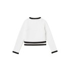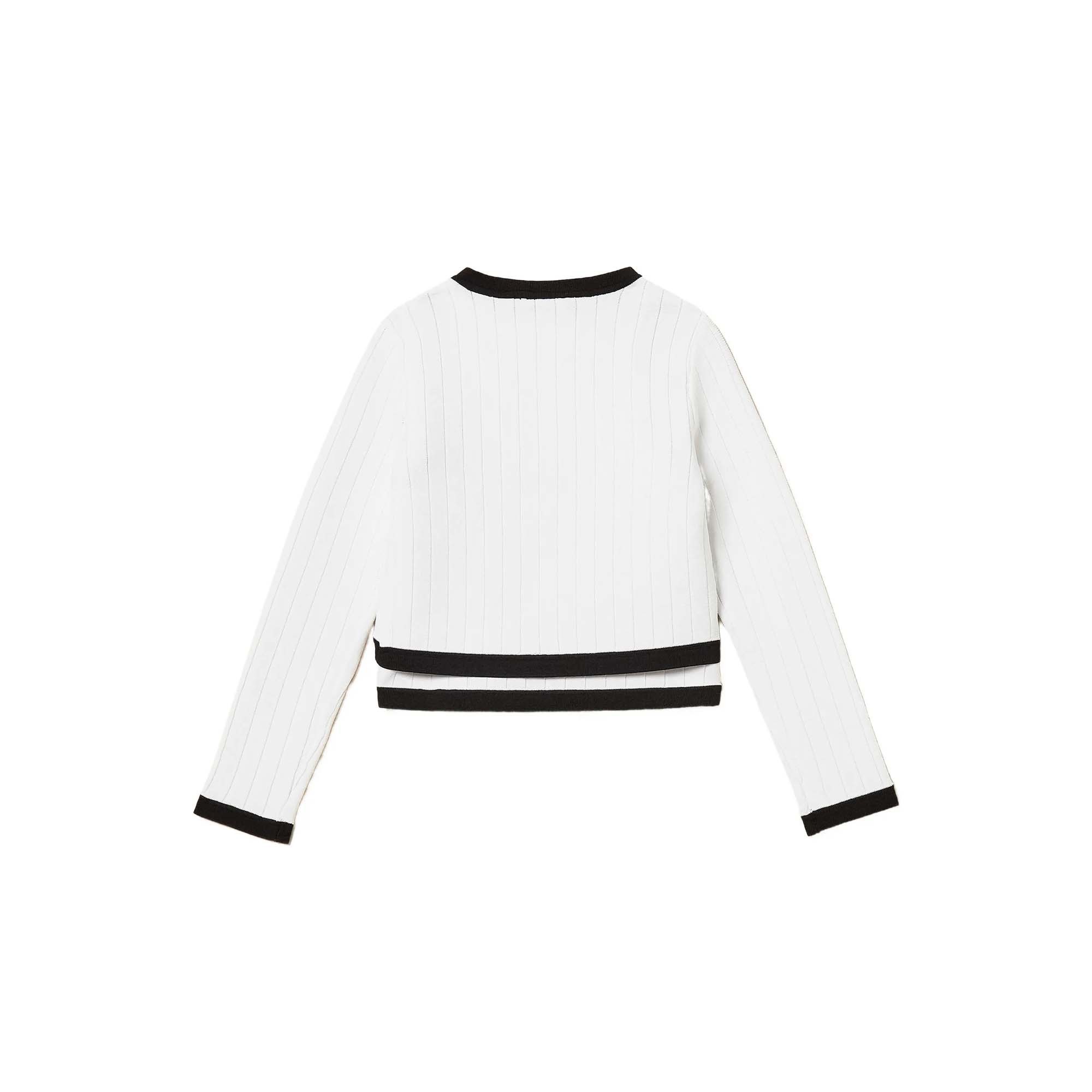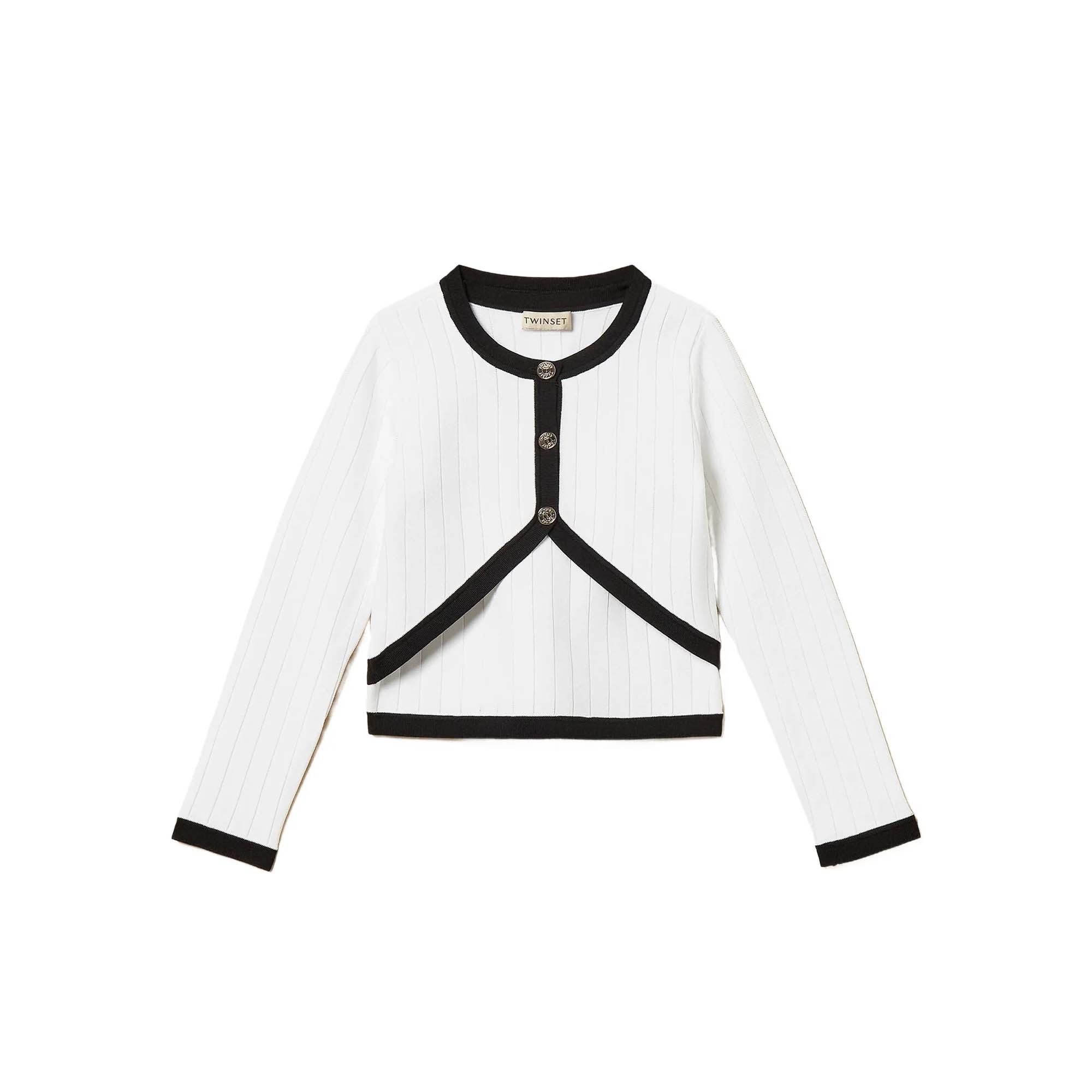 Cardigan bianco con orli neri, bottoni logati dorati,