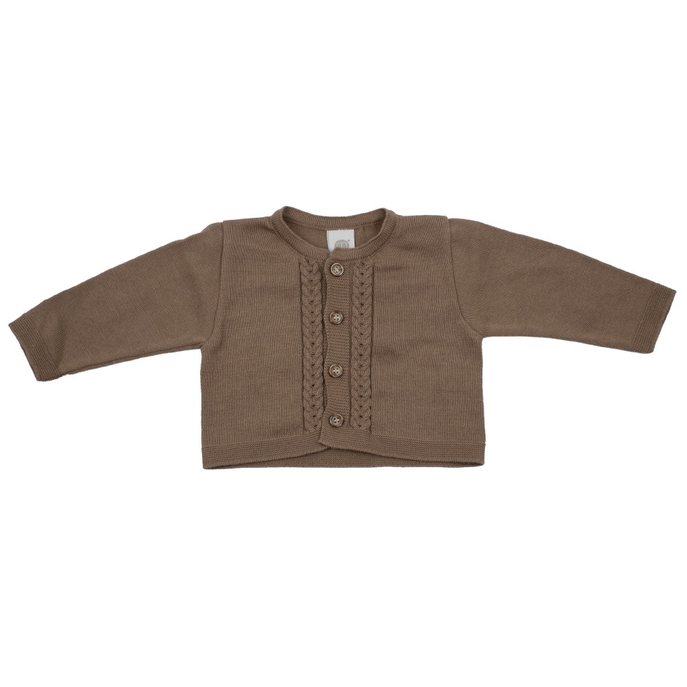 Completo3 pezzi di Marlu' in filato di cotone color naturale modello con polo in maglina elasticizzata panna con manica lunga con colletto in tessuto con dettagglio cacao Salopette color naturale bretelle con bottoncini candigan lavorato a treccia sul frontale bottoni