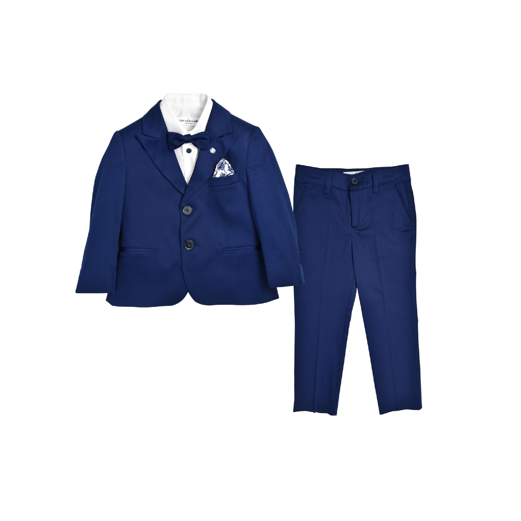 Completo per cerimonia composto da 5 pezzi camicia bianca con bottoni blu, papillon,pochette bianca con stampa fantasia fiori La giacca con bavero a lancia ha due tasche davanti e due spacchetti dietro e i bottoni blu sono tinta su tinta . Giacca, pantalone lungo e papillon sono di un blu baltico