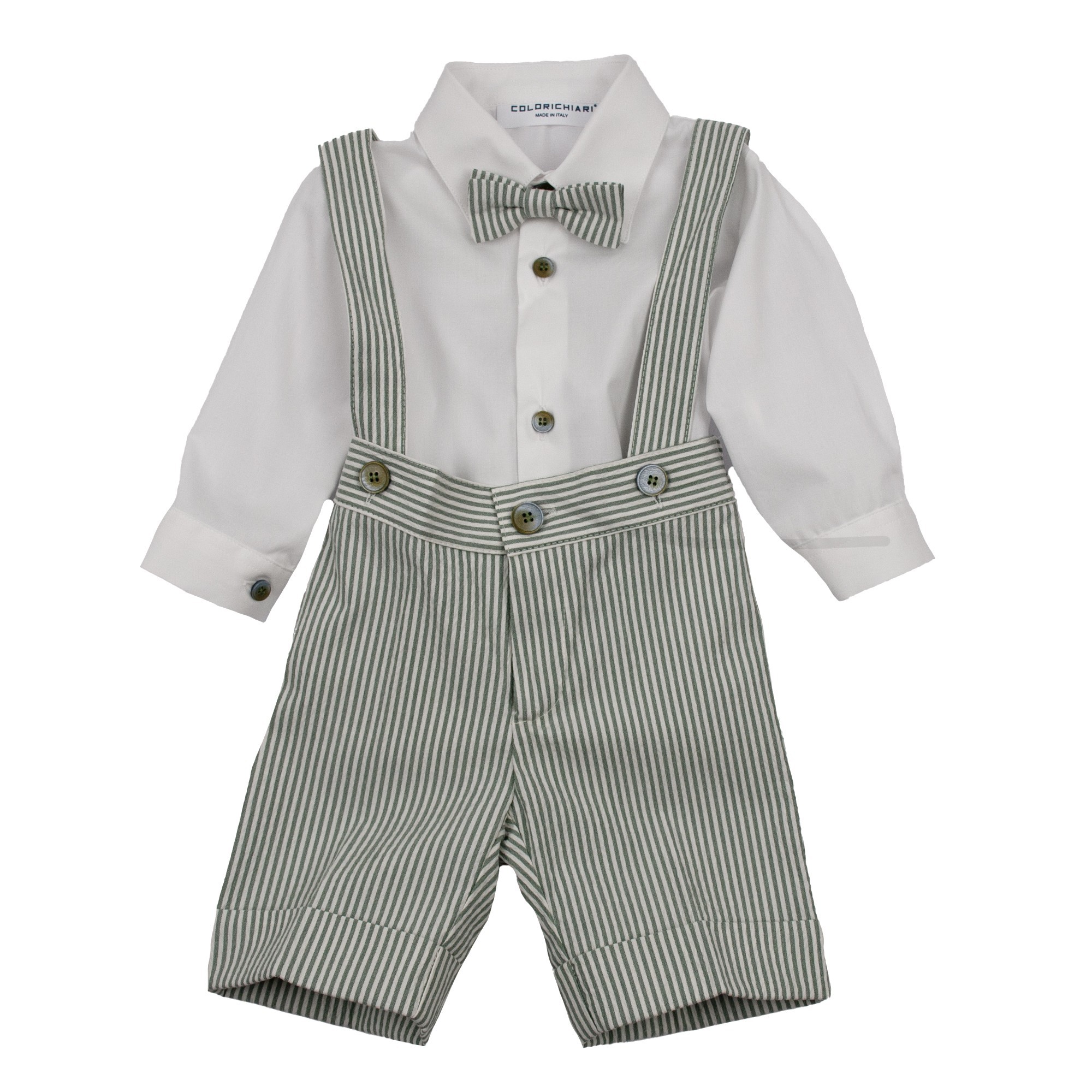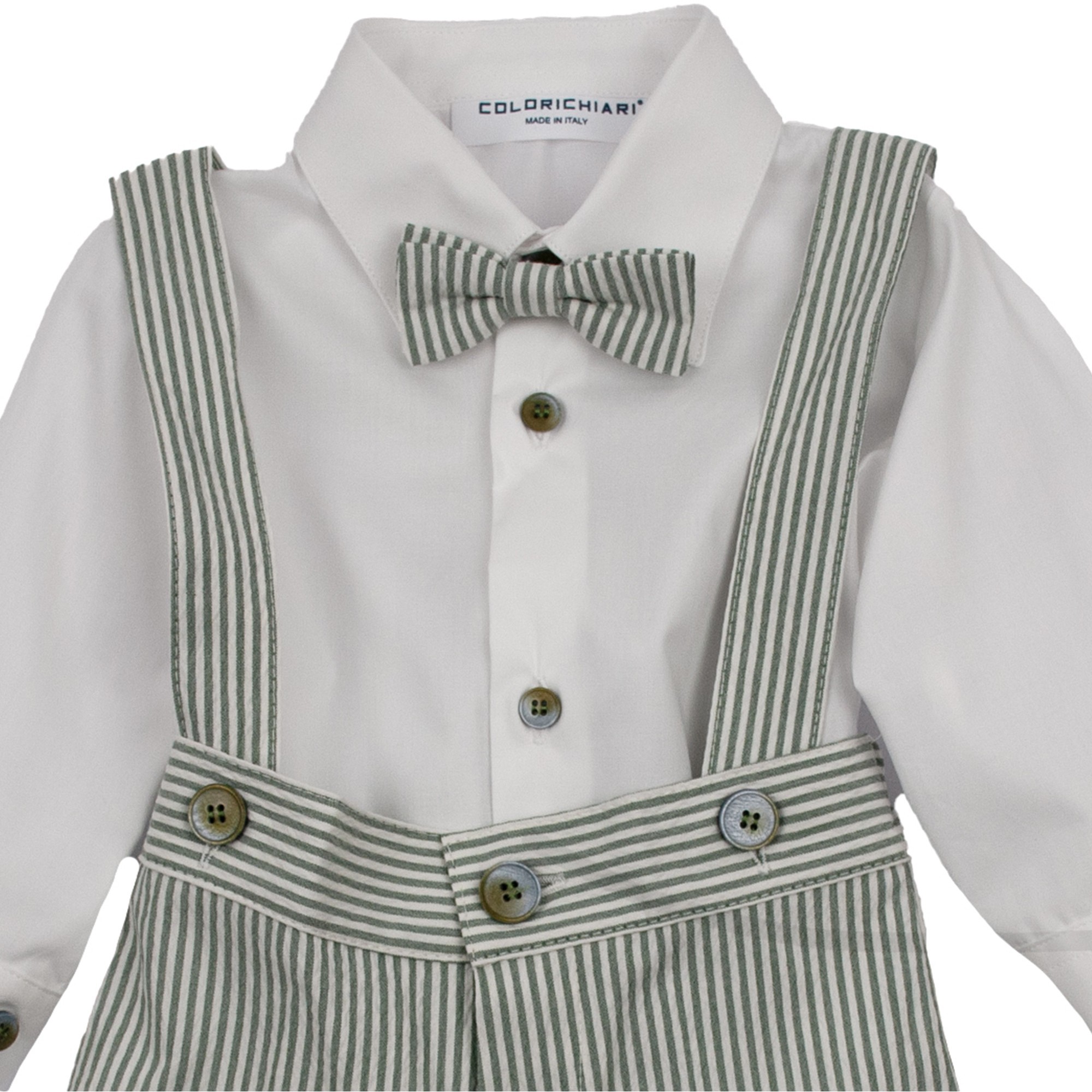 Completo pantalone e camicia di Colori Chiari composto da camicia manica lunga con bottoncini verdi come il papillon pantaloncino a righe bianco verde completamente foderato internamente e munito di bretelle