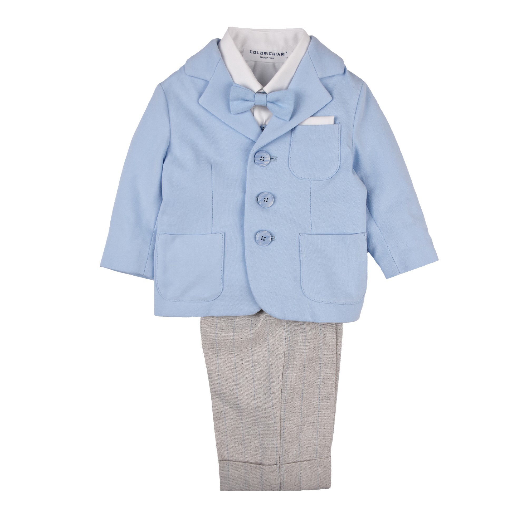 Completo elegante composto da 5 pezzi giacca morbida in tessuto punto milano bielastico camicia e pochette bianche,papillon celeste pantaloni in beige gessato celeste modello corto con bretelle e risvolto