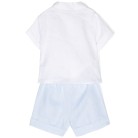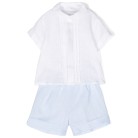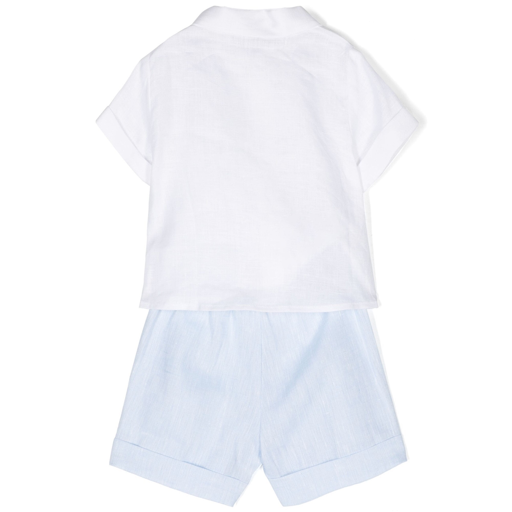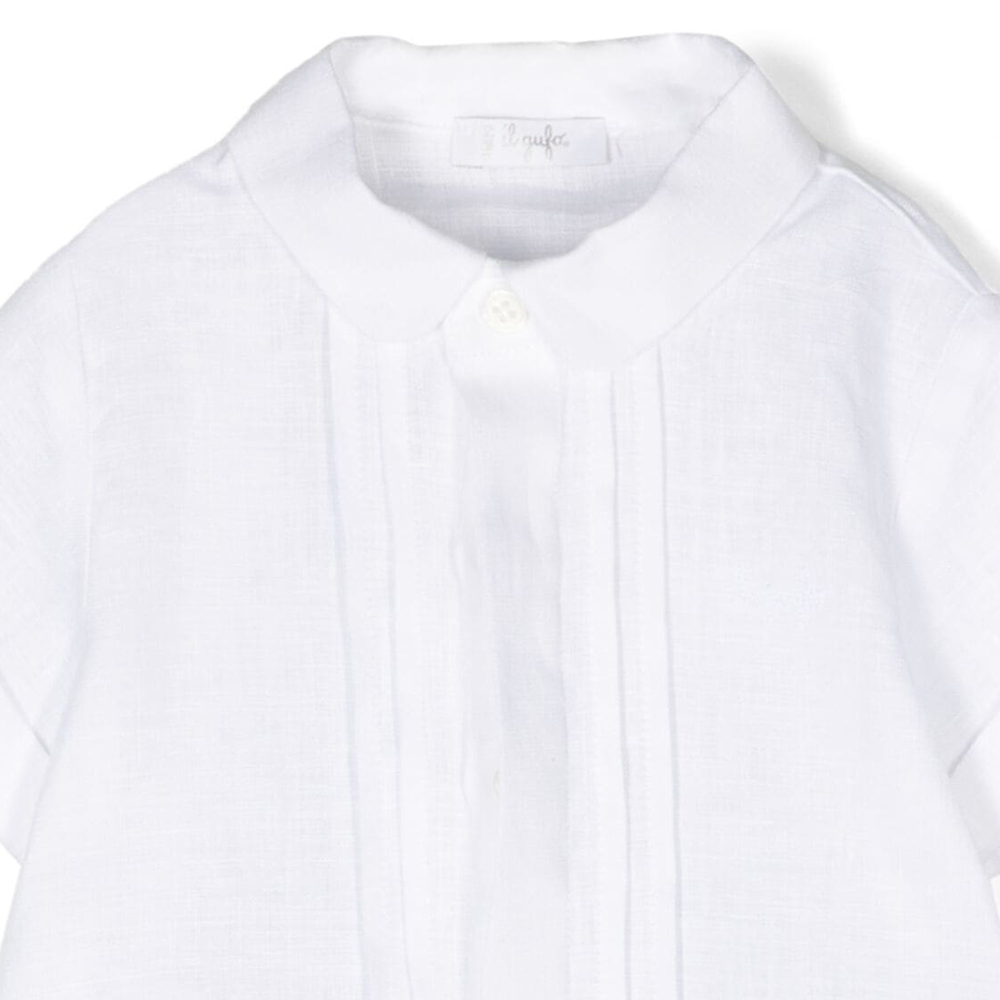 Completo due pezzi da neonato in 100% lino composto da una camicia a manica corta di colore bianco con colletto tondo, abbottonatura frontale coperta da finta con dettaglio di pieghe e logo ricamato Il Gufo a contrasto su lato cuore. Bermuda in lino salvia con elastico in vita, arricchito da due bottoncini decorativi ricoperti e da due piccole pinces frontali. Risvolto al fondo. Capo ideale per cerimonie o battesimi.
