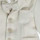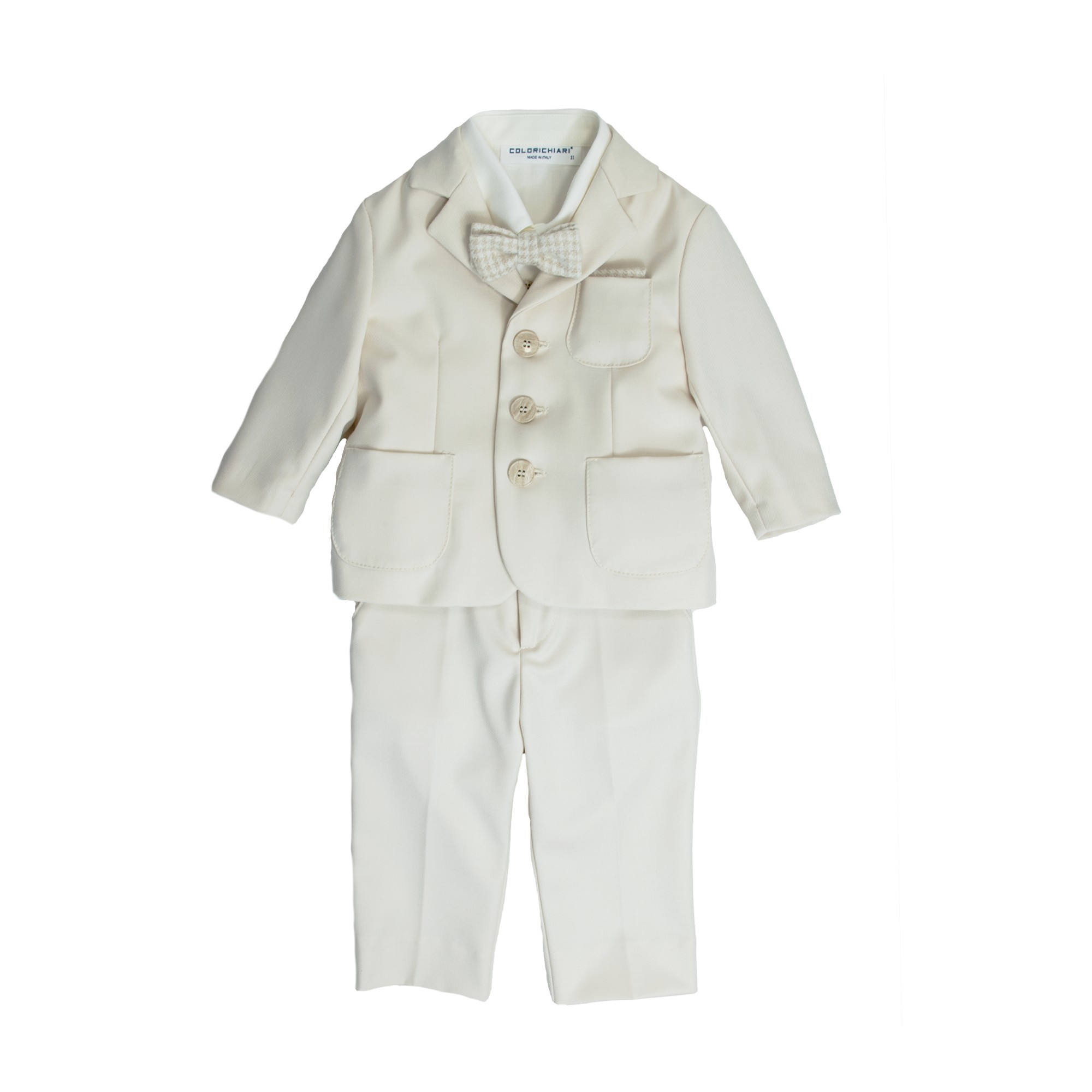 Completo 4 pezzi giacca tre bottoni destrutturata morbidissima con tasche avanti camicia panna con bottoni in beige pantalone con bretelle staccabili giacca e papillon removibile in tessuto panna