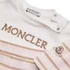 Cappellino e pantaloni beige a righe con logo, t-shirt bianca con logo beige ricamato e patch logo sulla manica.