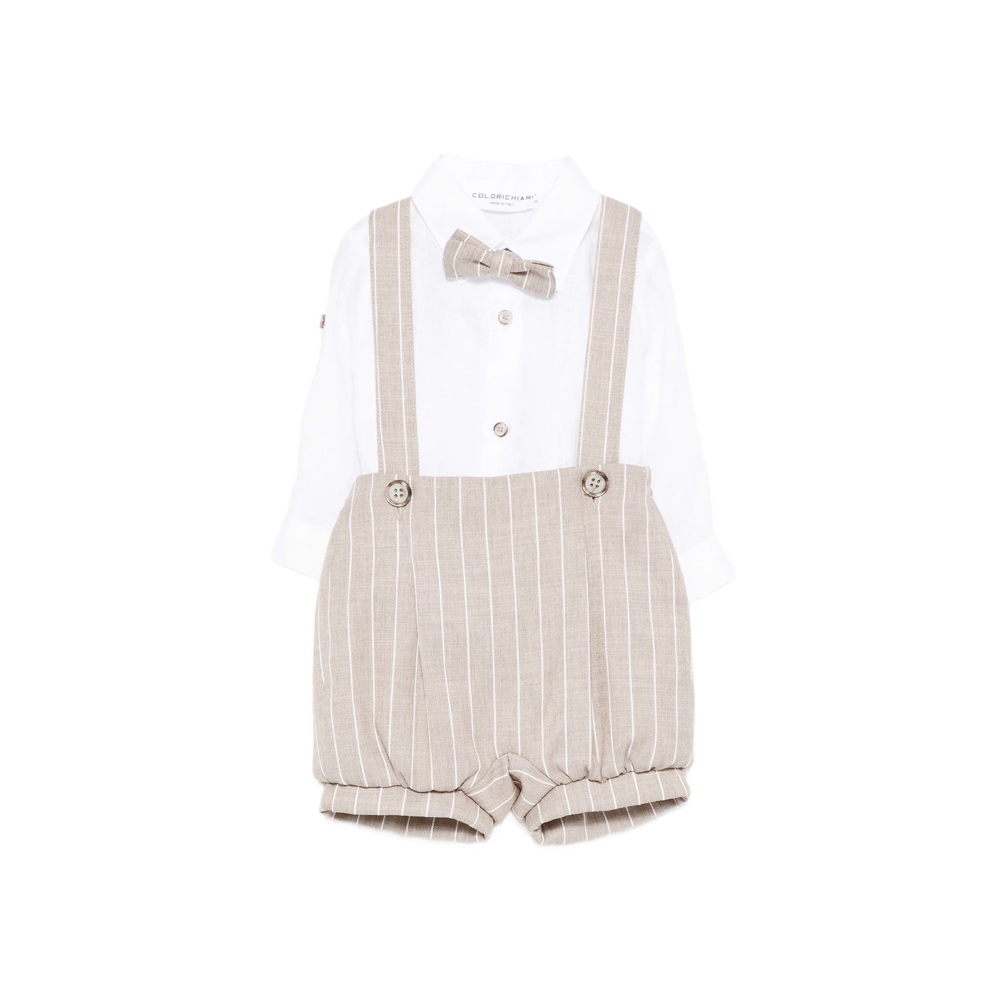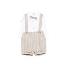 Pantaloncini beige a righe con bretelle e bottoni, vita elasticizzata.