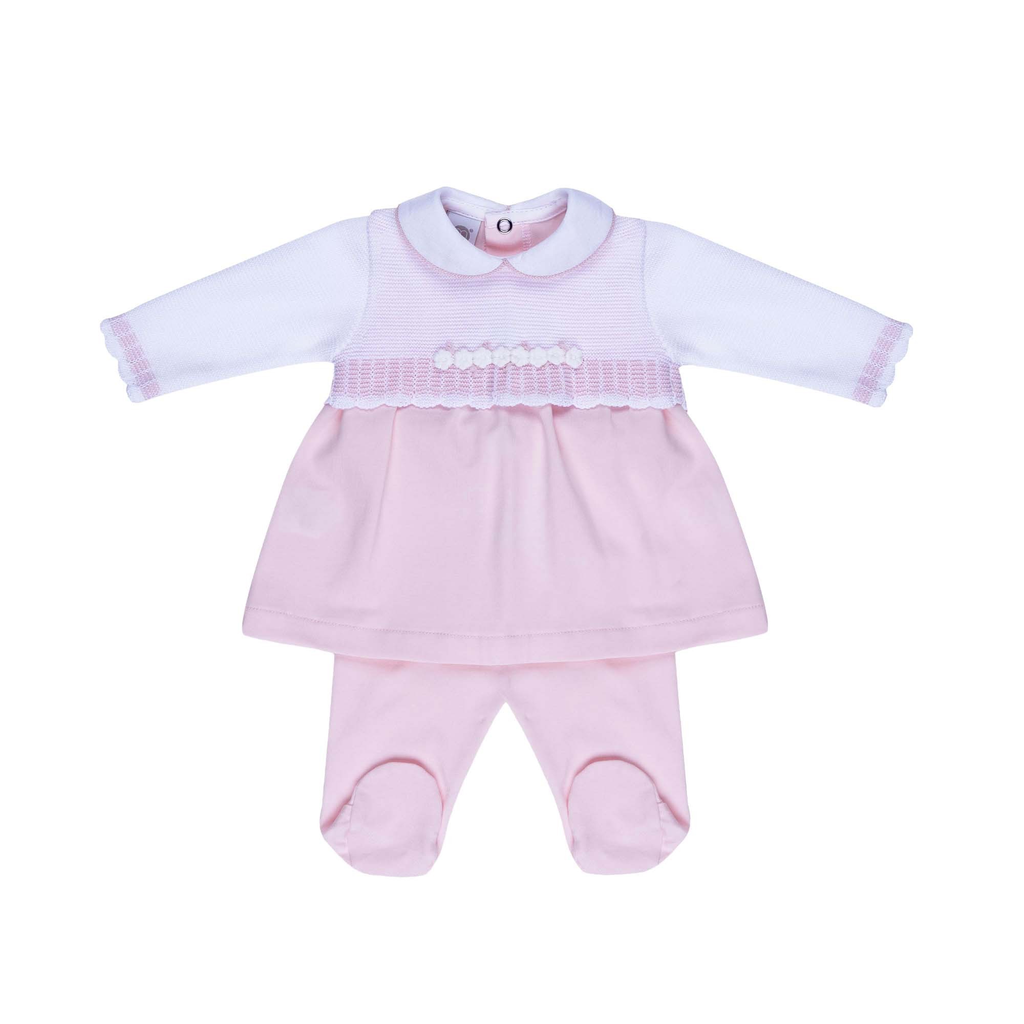 maniche lunghe, gonna rosa in jersey, fiorellini bianchi sul petto, filato di cotone ultrafine, pantaloni rosa in jersey con piedini