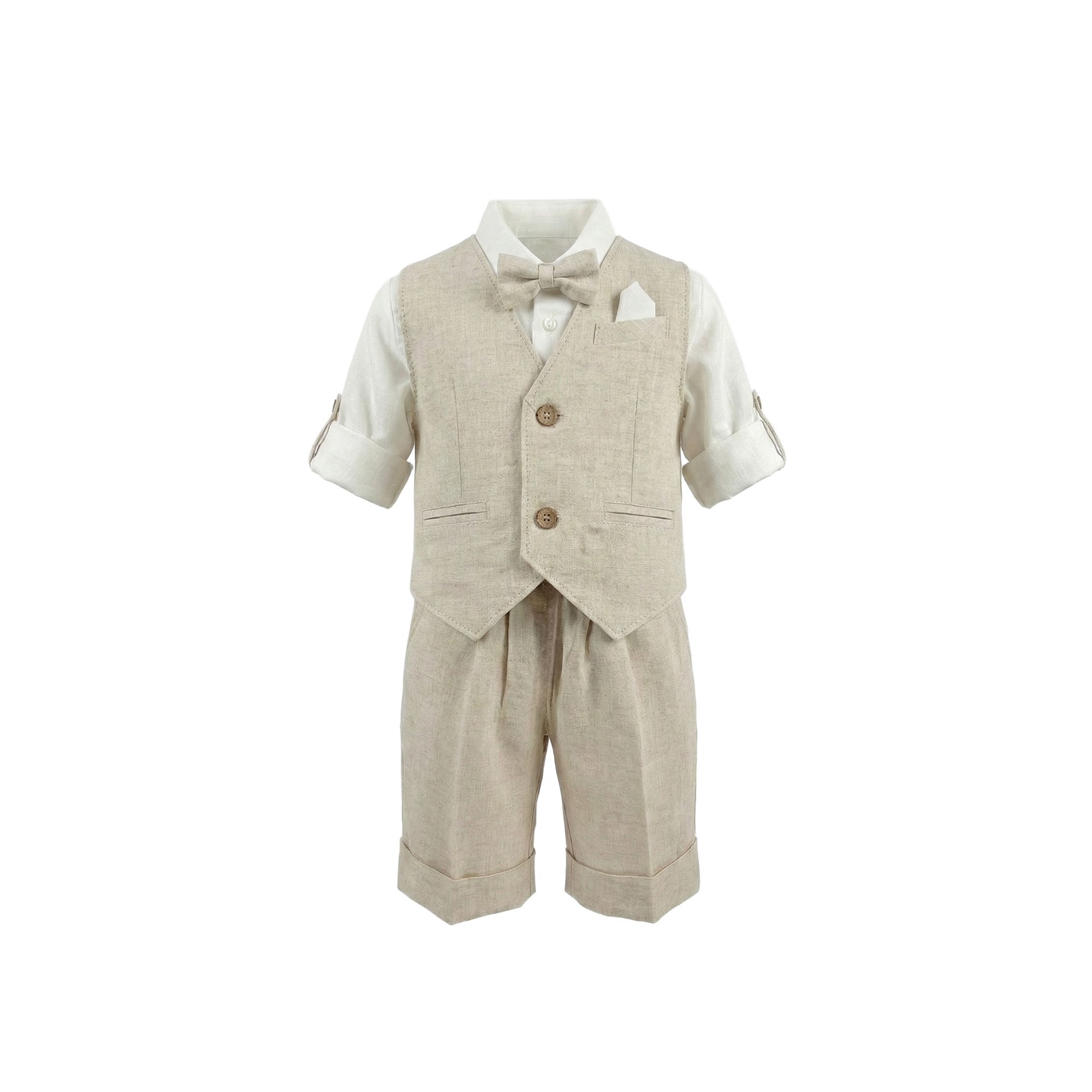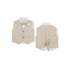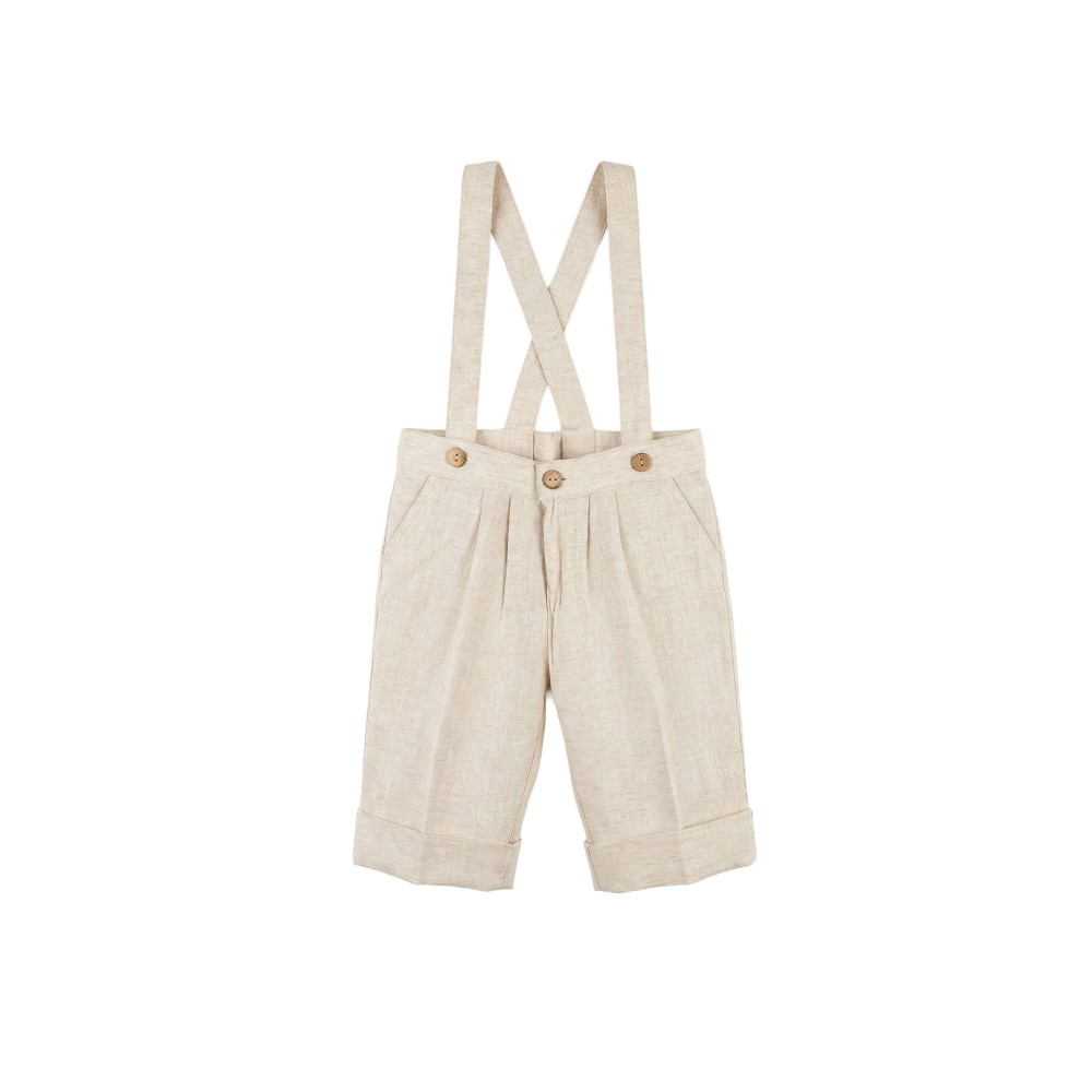 Pantaloni beige con bretelle e bottoni, gilet beige con bottoni,